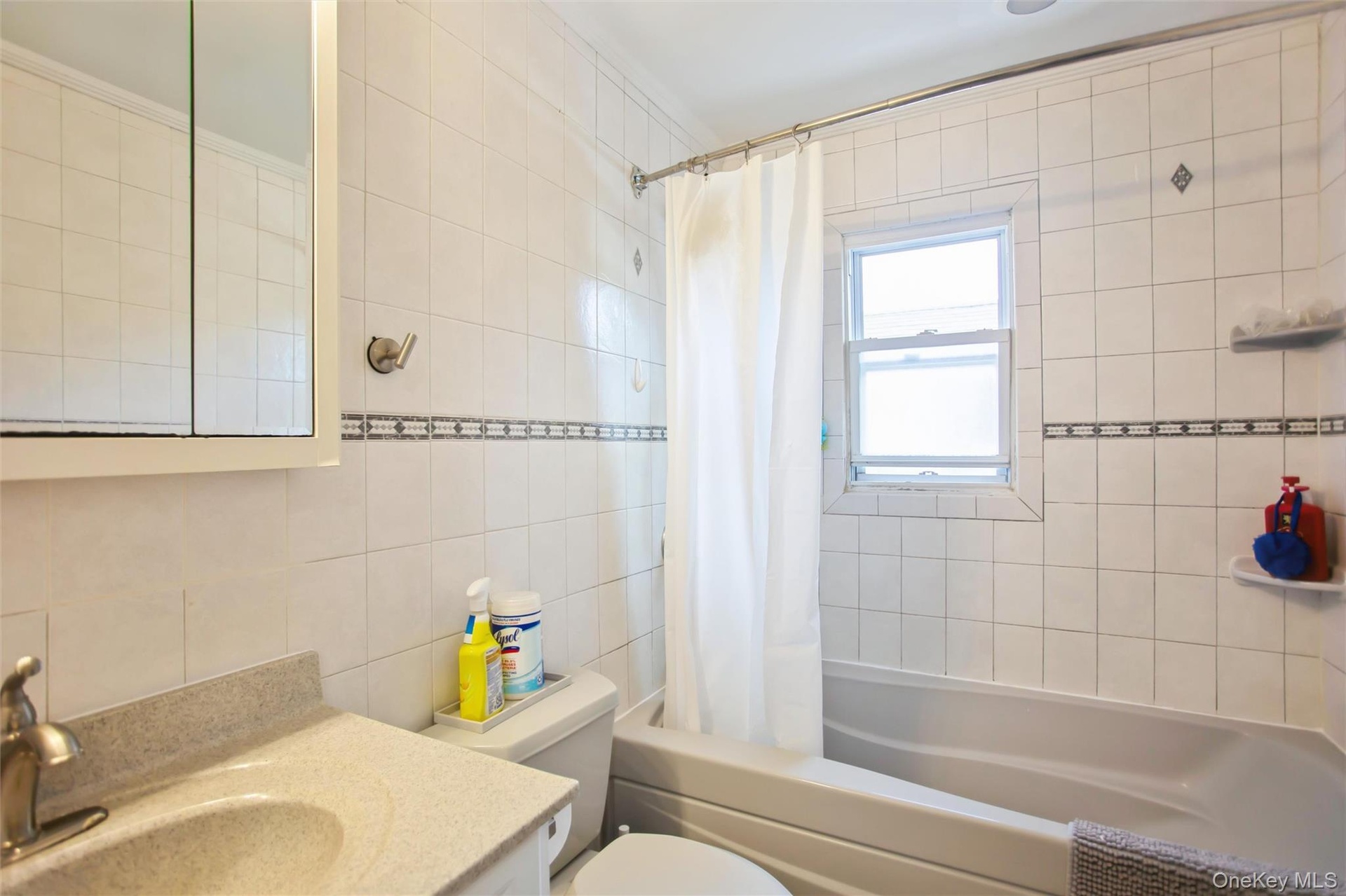 - Full bathroom with shower / bathtub combination with curtain, tile walls, and vanity