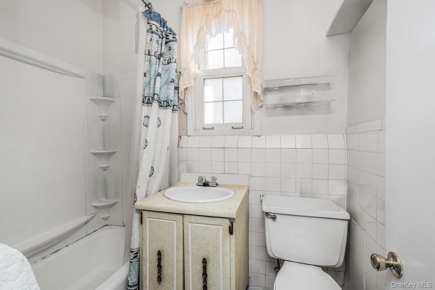 - Full bathroom featuring shower / bath combo, toilet, tile walls, and vanity