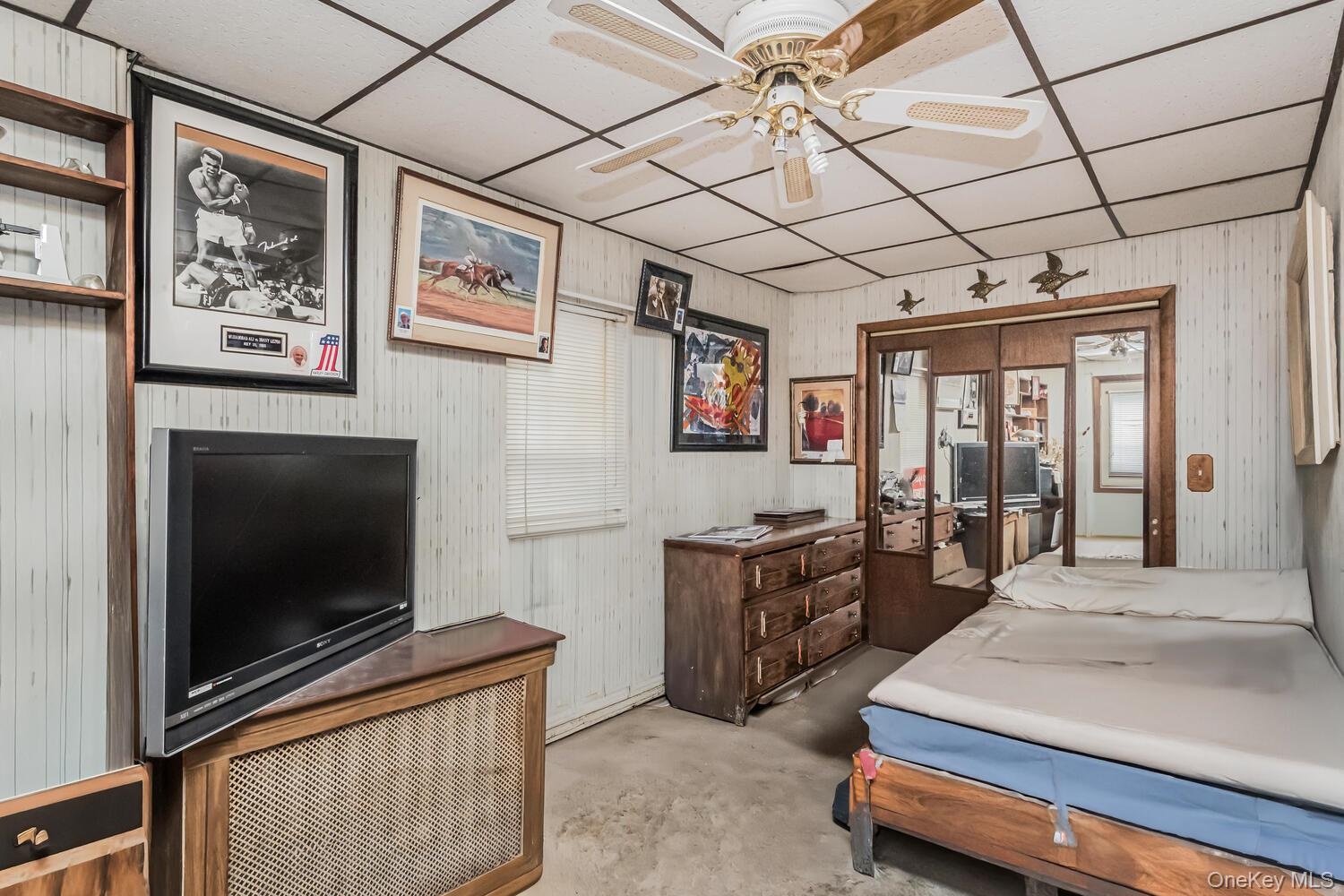 - Bedroom 2- featuring a paneled ceiling, ceiling fan, and wood walls