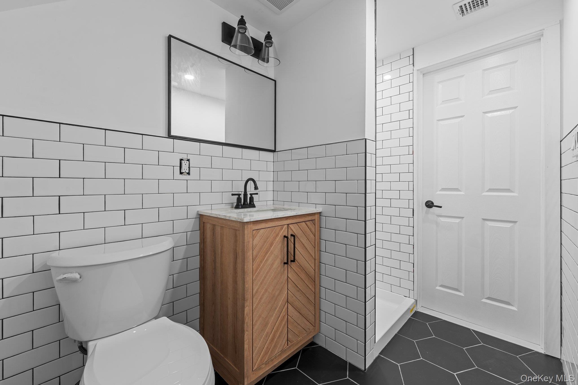 - Bathroom featuring vanity, tile walls, dark tile patterned floors, and a tile shower