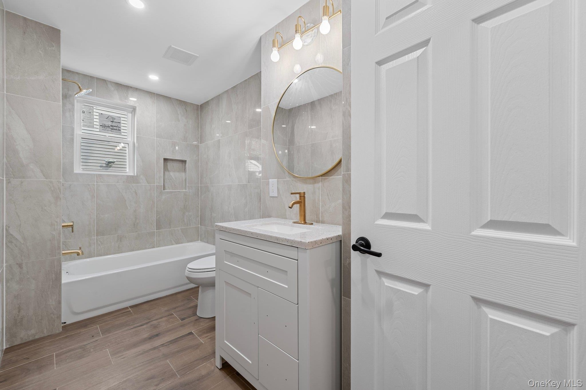- Bathroom with shower / bath combination, tile walls, vanity, wood finish floors, and recessed lighting