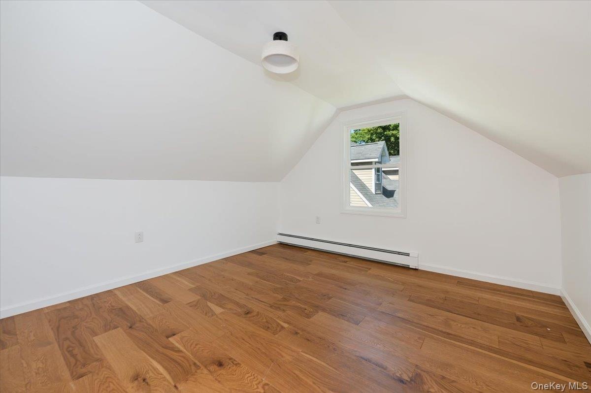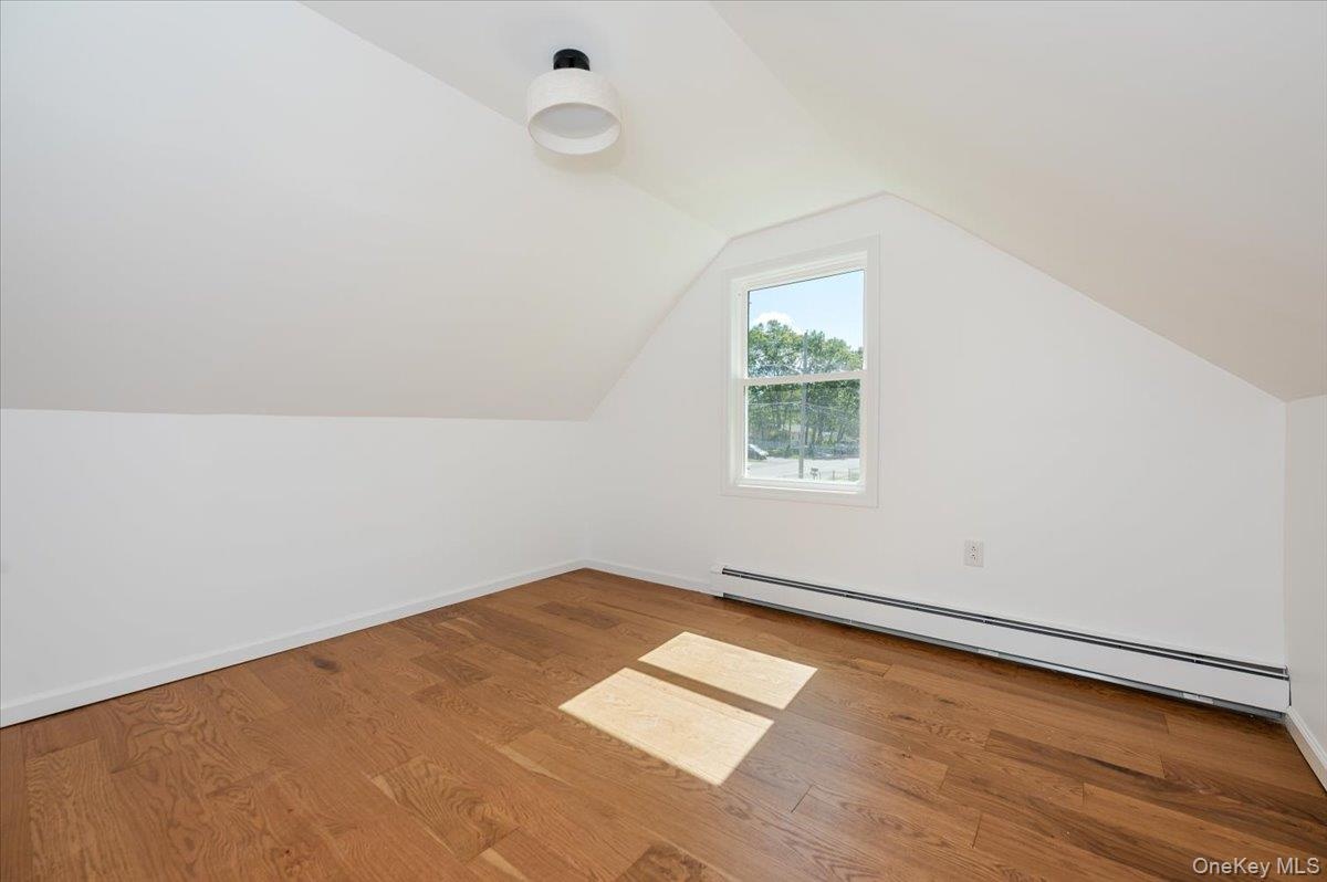 - Additional living space featuring baseboard heating, vaulted ceiling, and wood finished floors