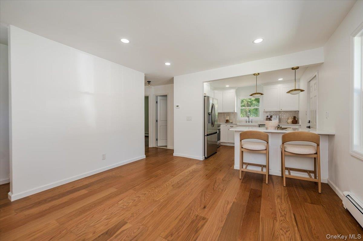 - Kitchen with recessed lighting, a kitchen bar, baseboard heating, a peninsula, and white cabinets