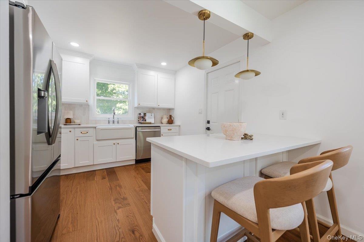 - Kitchen with a breakfast bar area, appliances with stainless steel finishes, a peninsula, white cabinetry, and recessed lighting