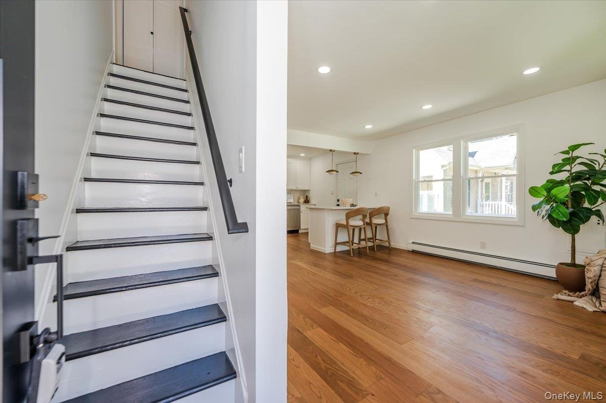 - Stairs featuring recessed lighting, wood finished floors, and a baseboard radiator