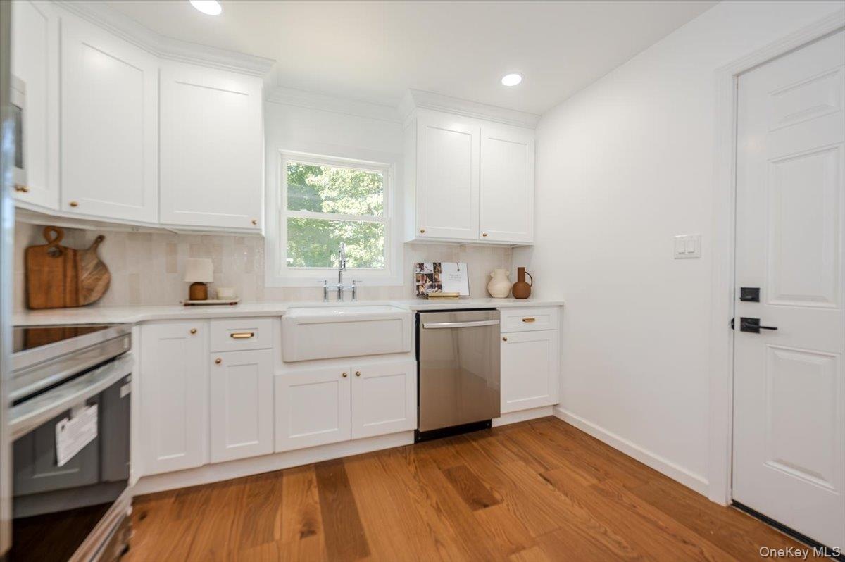 - Kitchen with white cabinets, backsplash, appliances with stainless steel finishes, light wood-type flooring, and recessed lighting