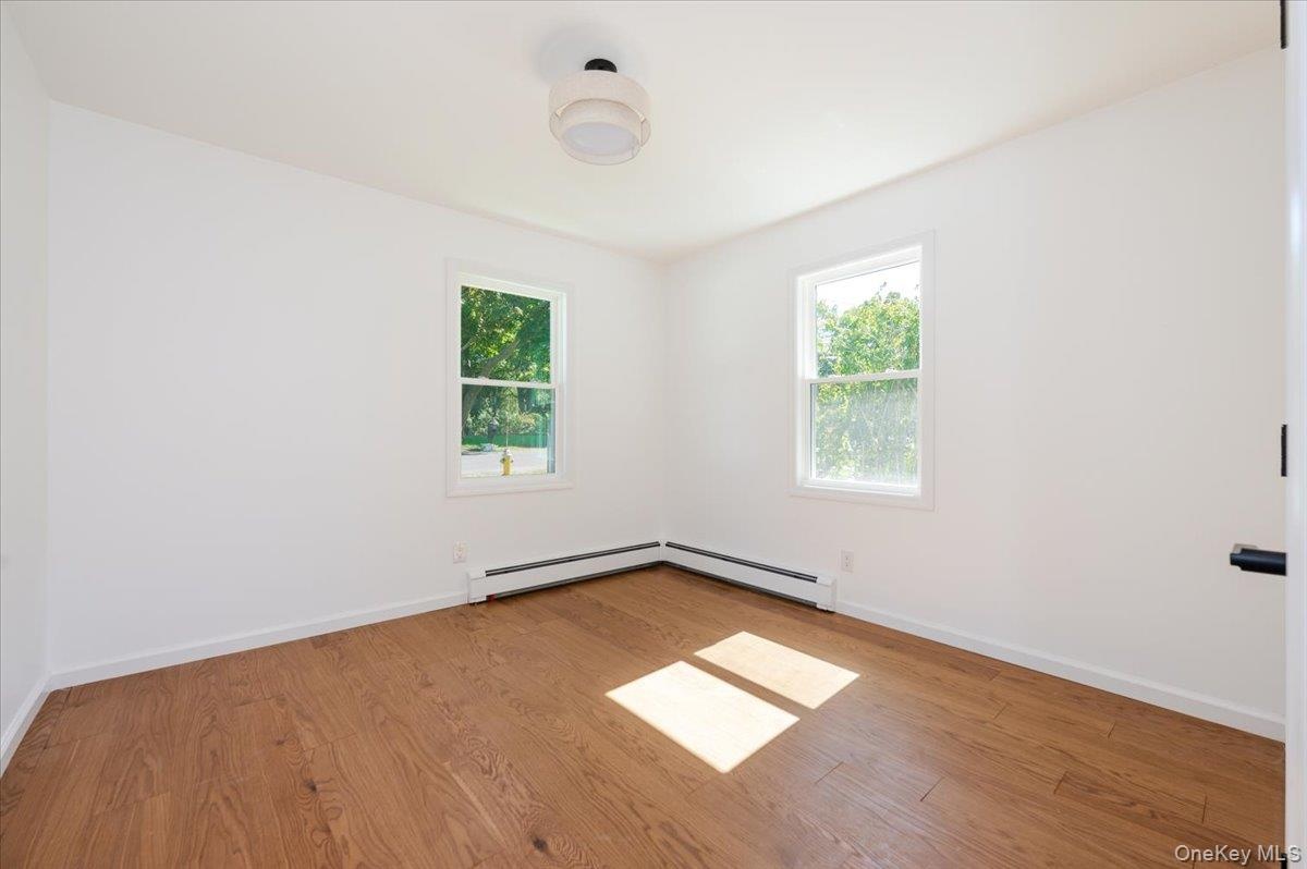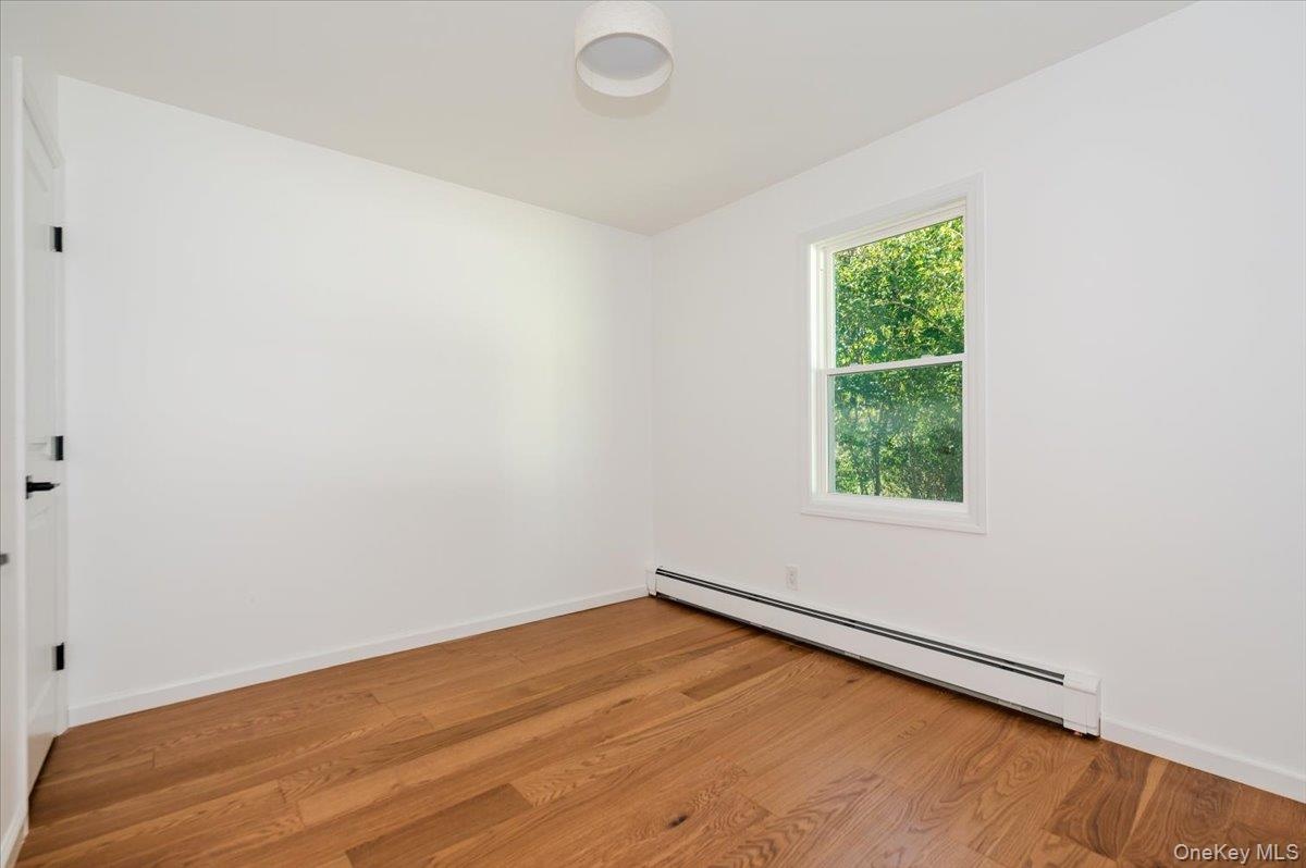 - Unfurnished room with a baseboard radiator and light wood-style floors