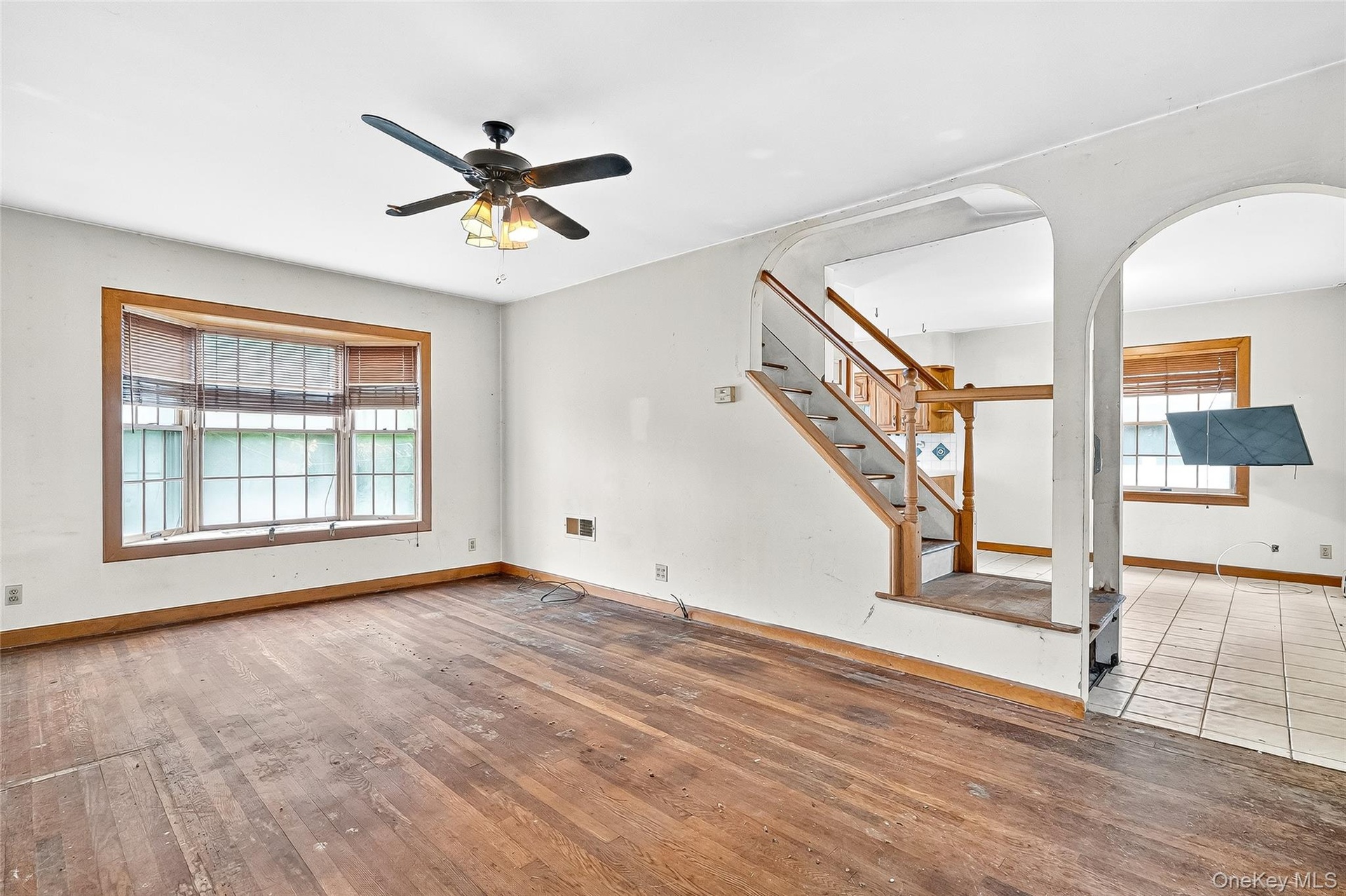 - Unfurnished living room featuring stairs, plenty of natural light, hardwood / wood-style floors, and arched walkways