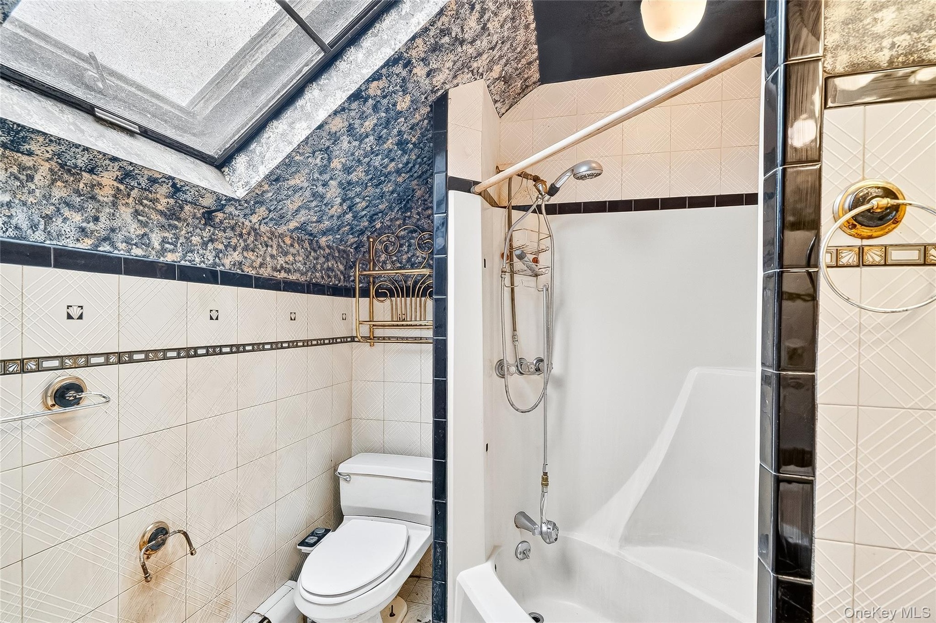 - Full bath featuring tile walls, wallpapered walls, and shower / bath combination