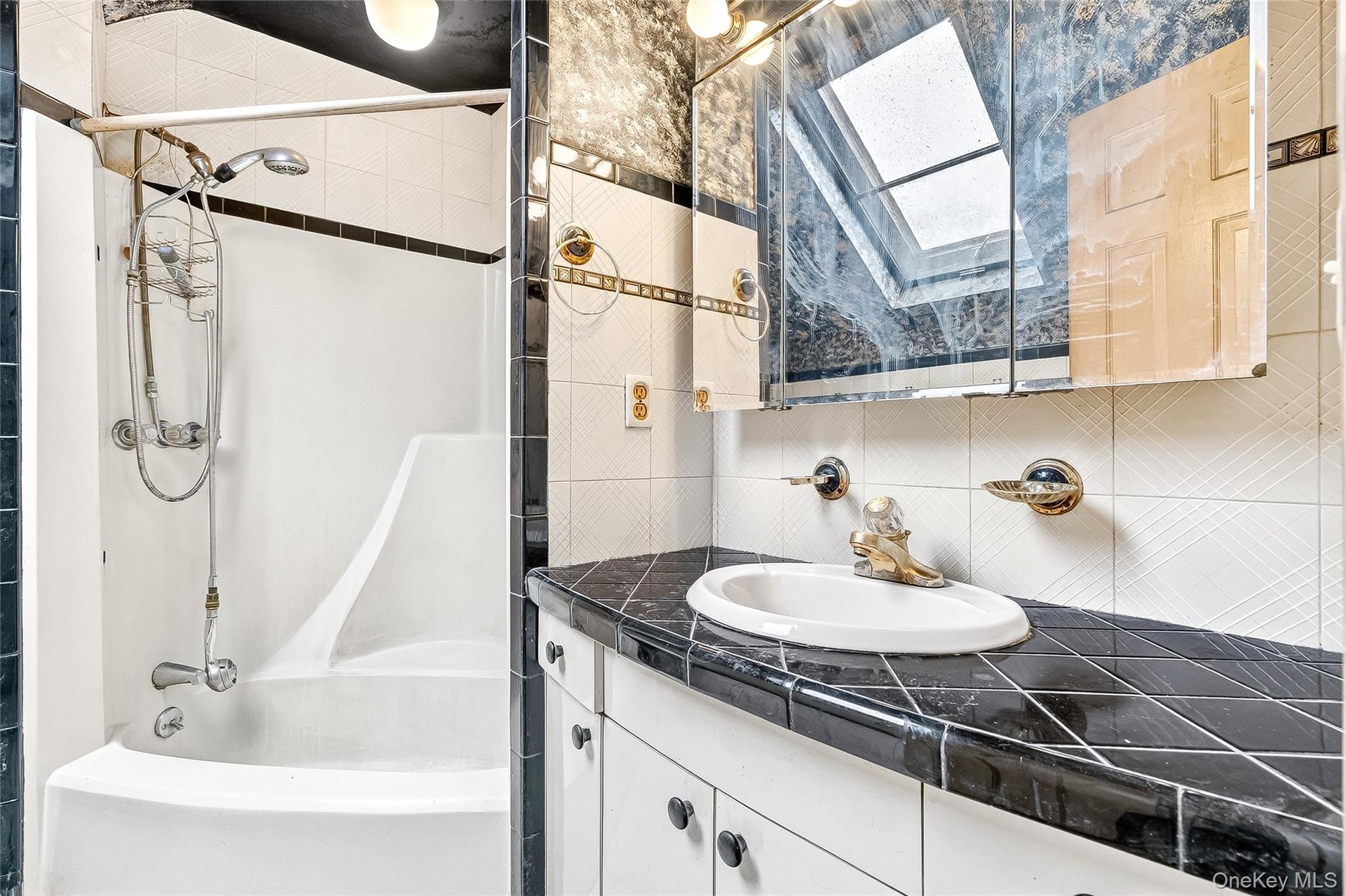 - Bathroom featuring vanity, shower combination, tile walls, and tasteful backsplash
