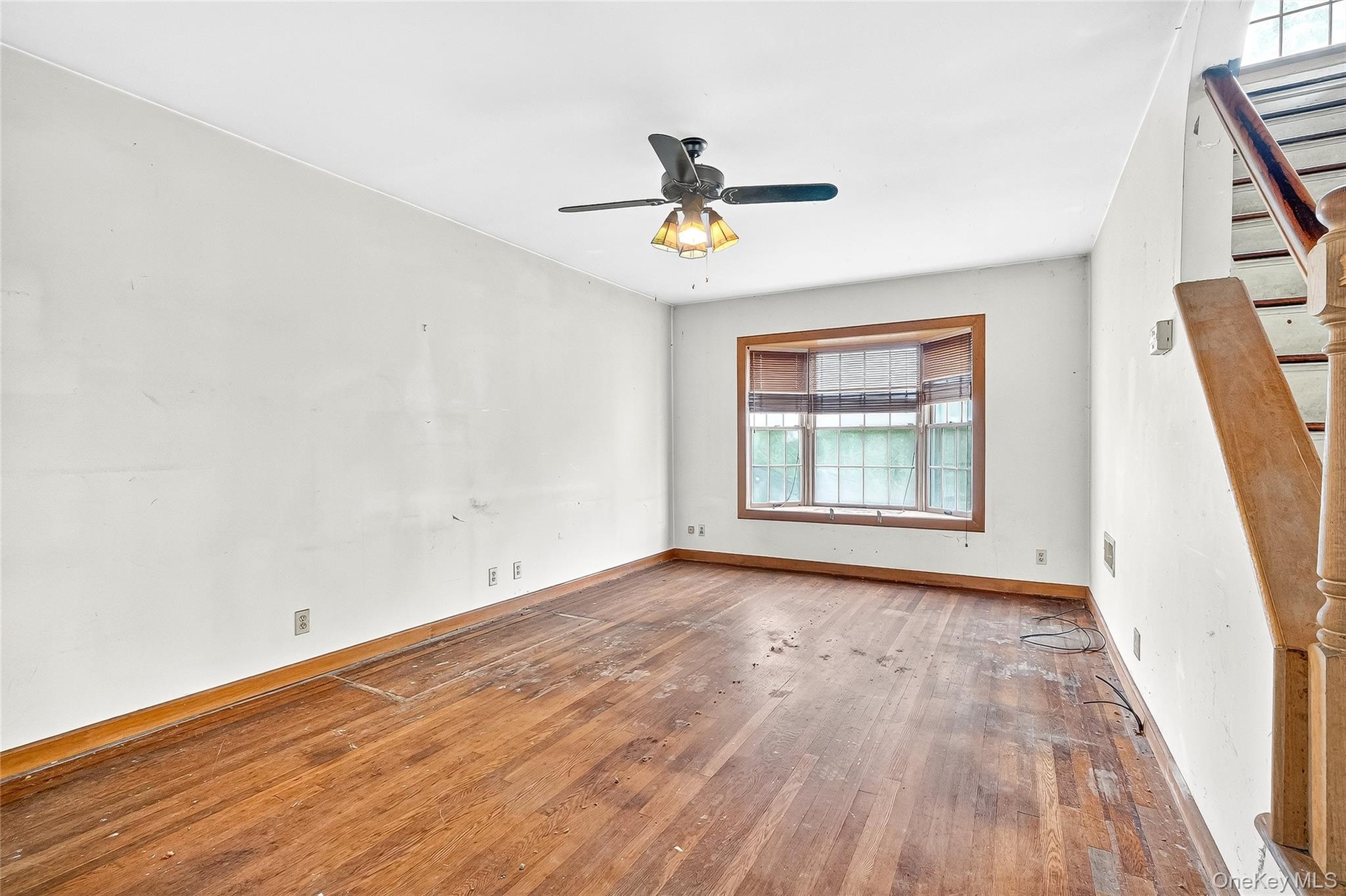 - Spare room with stairway, hardwood / wood-style floors, and a ceiling fan