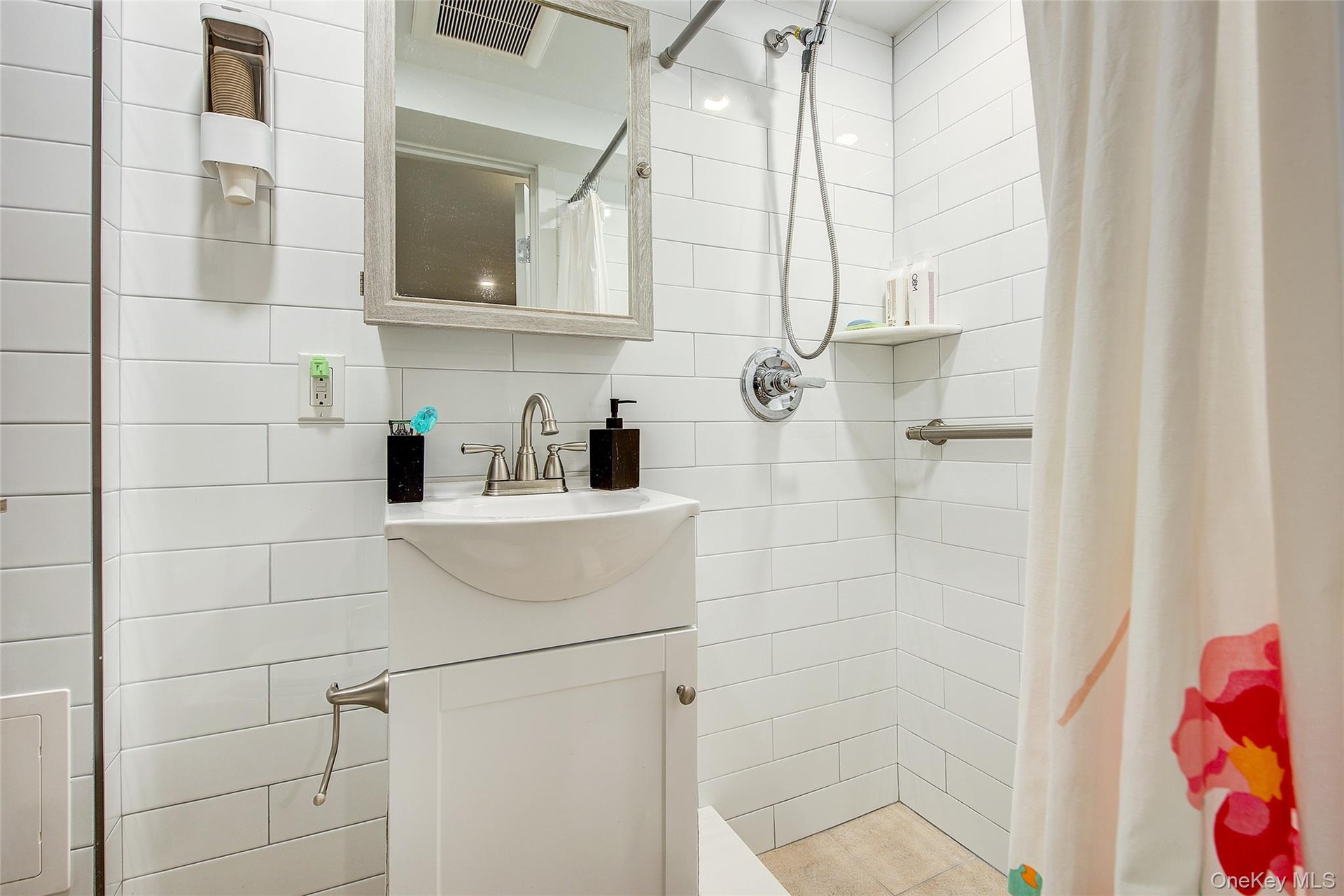 - Bathroom featuring vanity, tiled shower, tile walls, and decorative backsplash