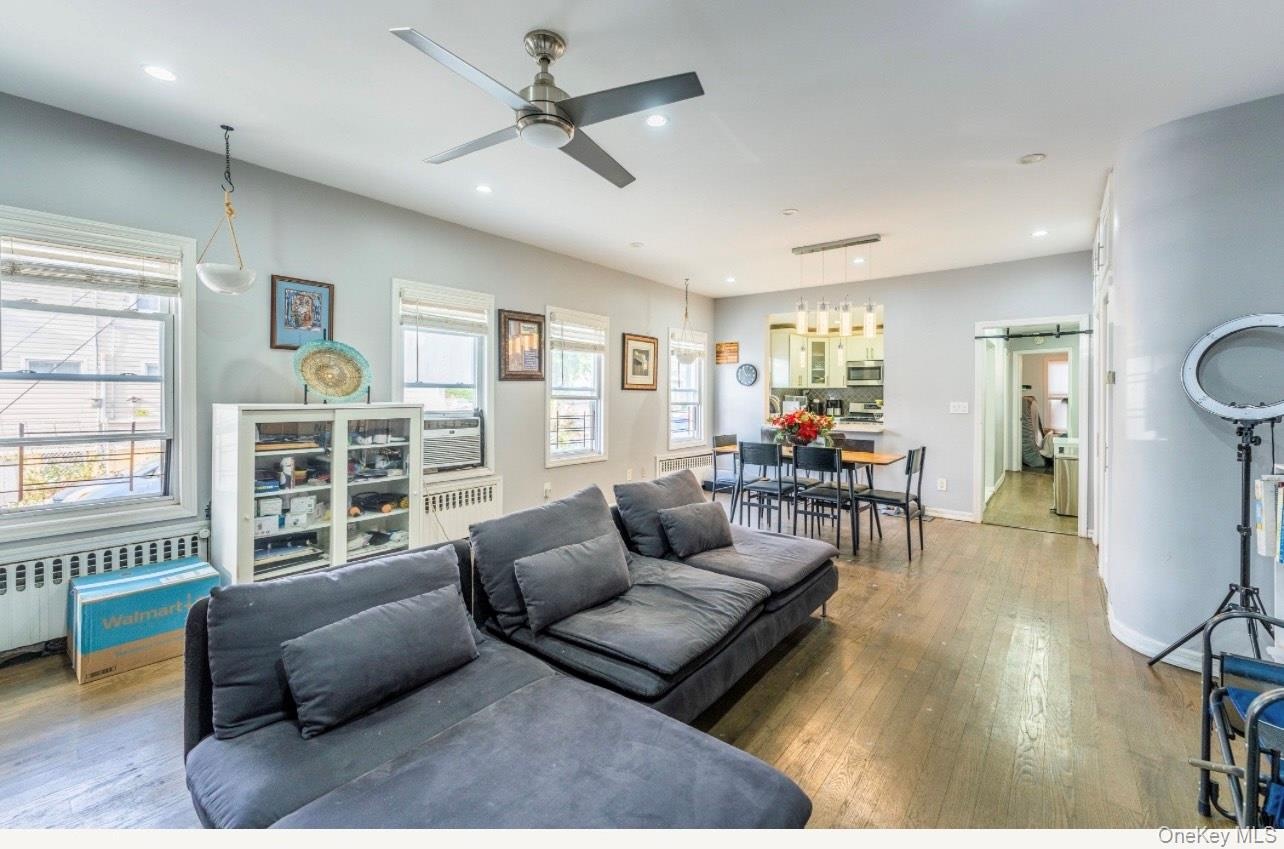 - Living room with a barn door, wood-type flooring, recessed lighting, radiator, and a ceiling fan