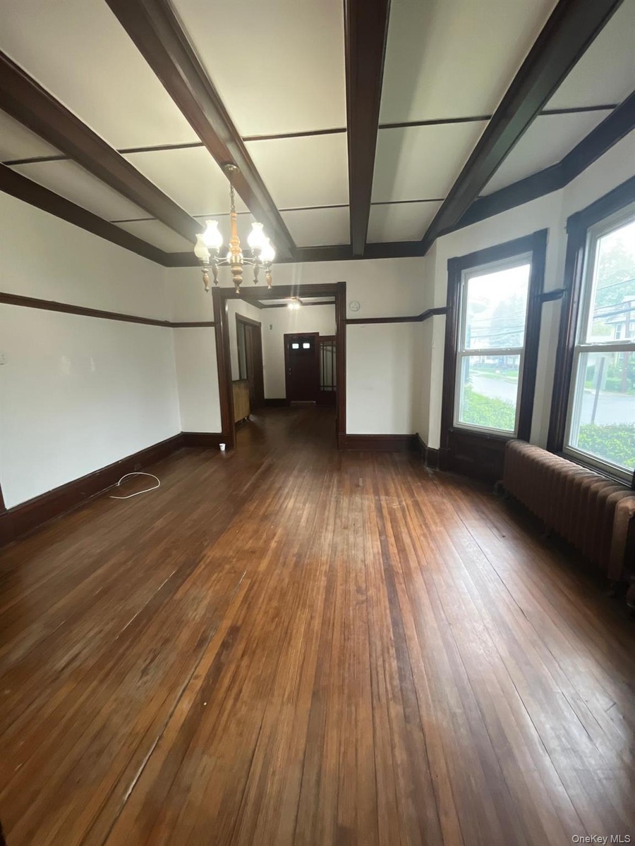 - Empty room with beam ceiling, radiator, dark wood finished floors, and a chandelier