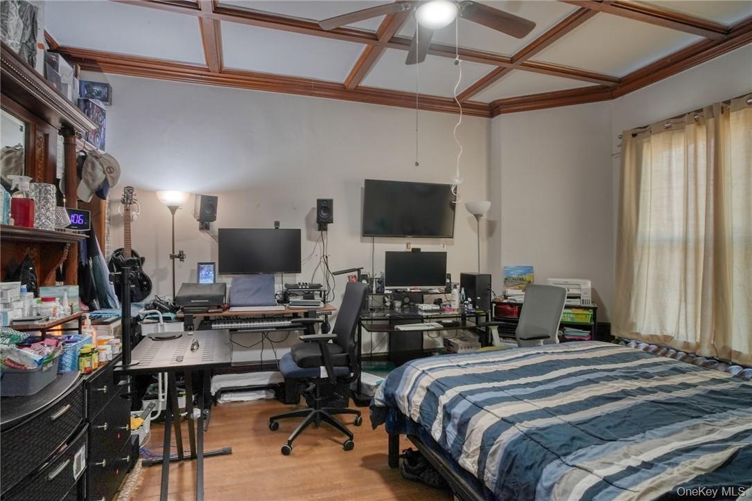 - Bedroom featuring ceiling fan, coffered ceiling, and light hardwood / wood-style flooring