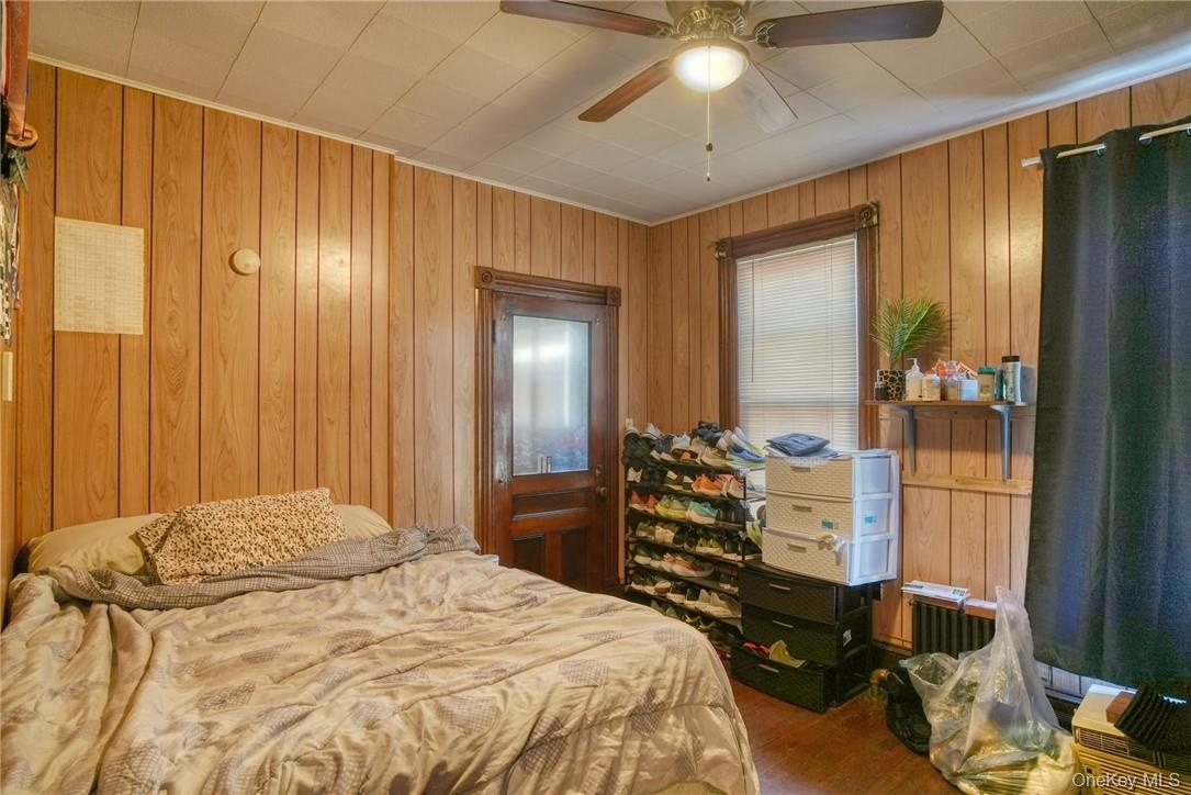 - Bedroom with ceiling fan, crown molding, radiator heating unit, and wooden walls