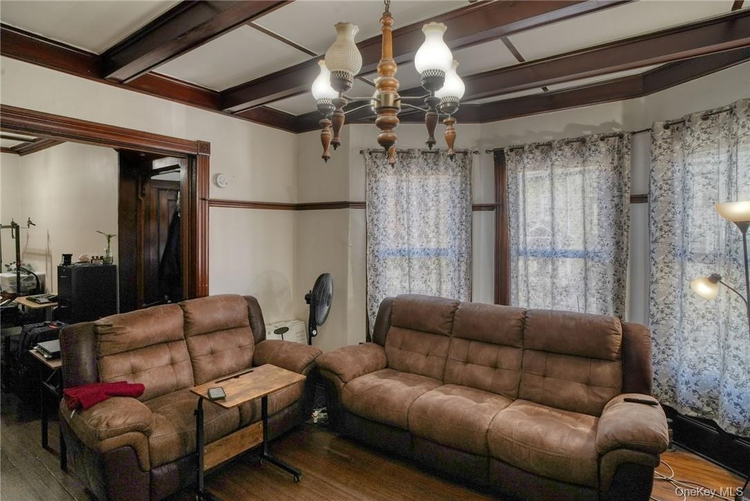 - Living room with beamed ceiling, a chandelier, and wood-type flooring