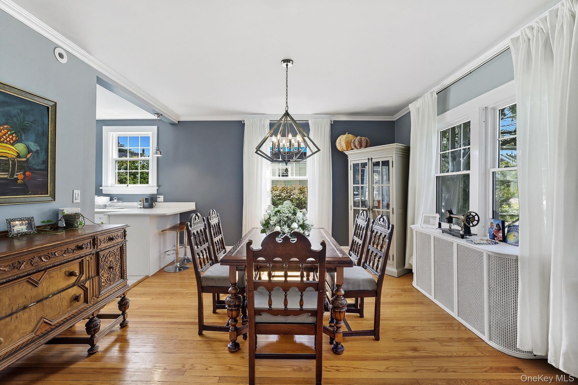 - Dining room with crown molding, light wood-style floors, and a chandelier