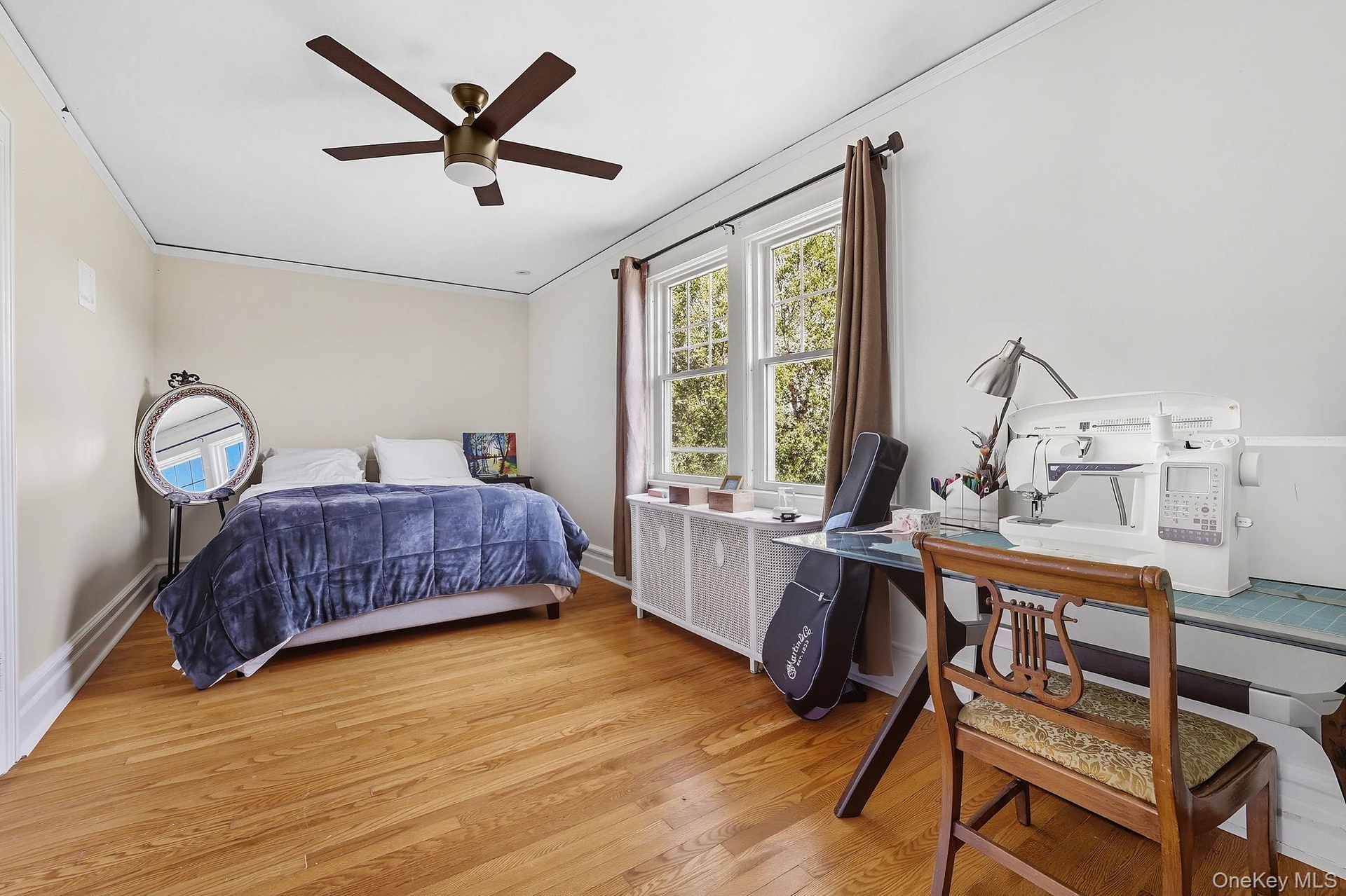 - Bedroom with light wood-style floors, crown molding, and a ceiling fan