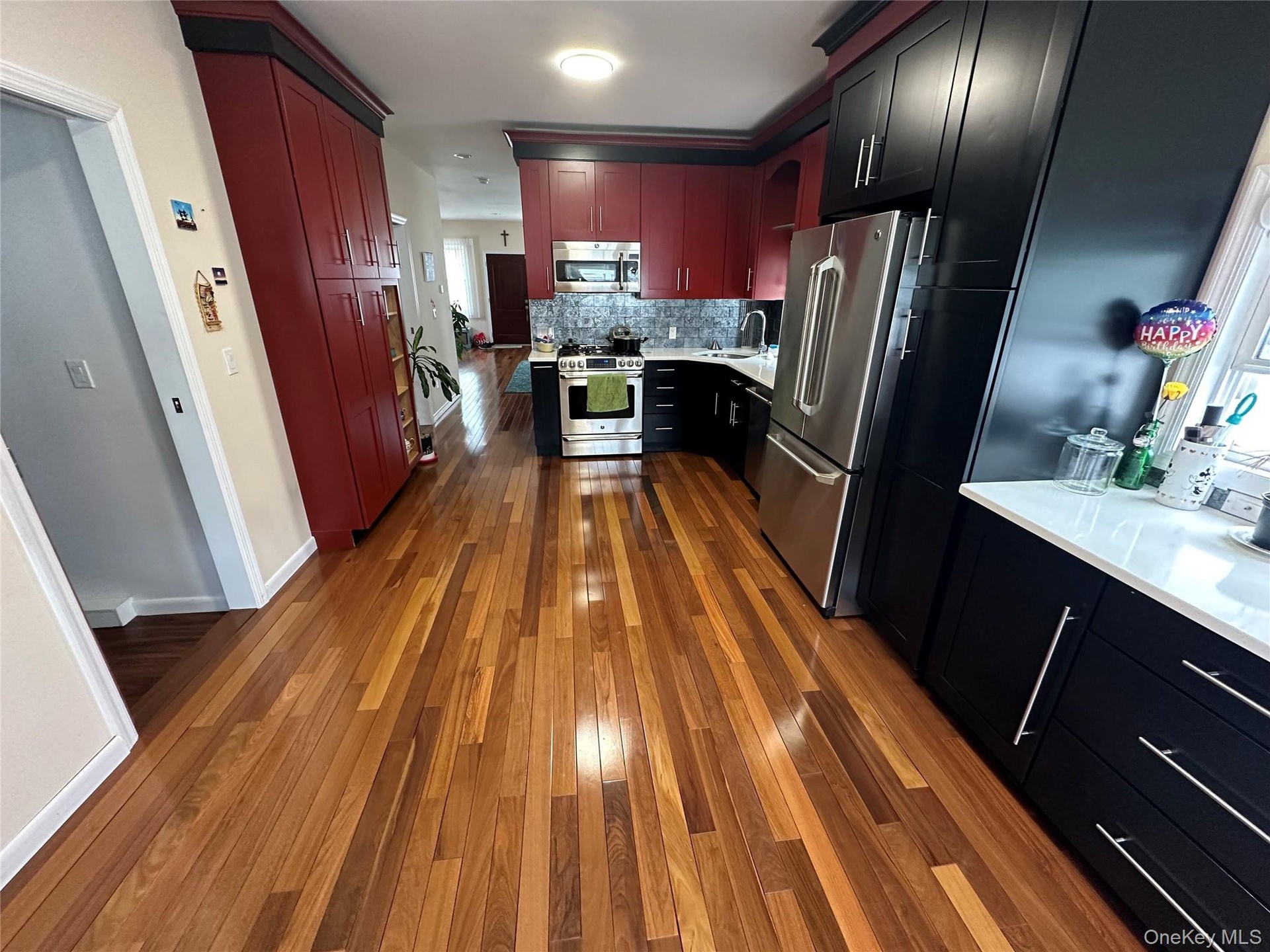 - Kitchen featuring healthy amount of natural light, appliances with stainless steel finishes, tasteful backsplash, and dark wood-type flooring