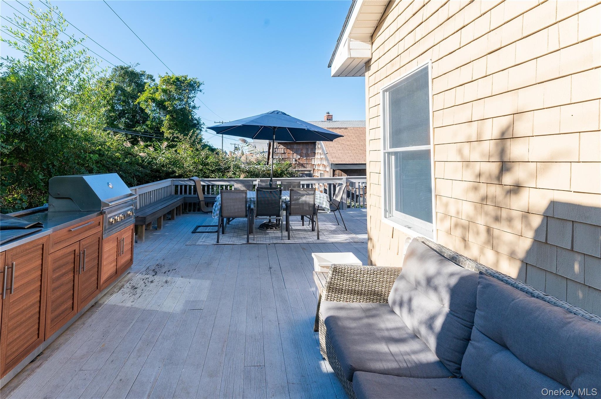 - View of patio / terrace with outdoor dining area, a wooden deck, and exterior kitchen sink, Barbecue