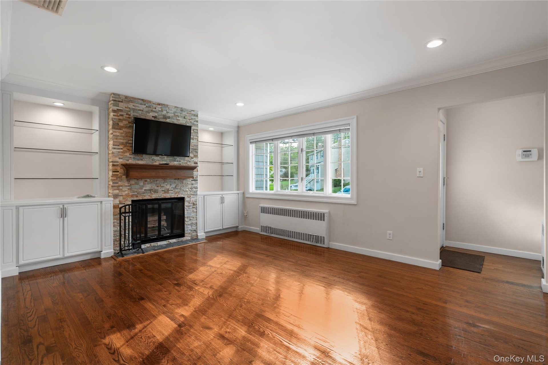 - Unfurnished living room featuring radiator heating unit, ornamental molding, dark wood-style flooring, a stone fireplace, and recessed lighting