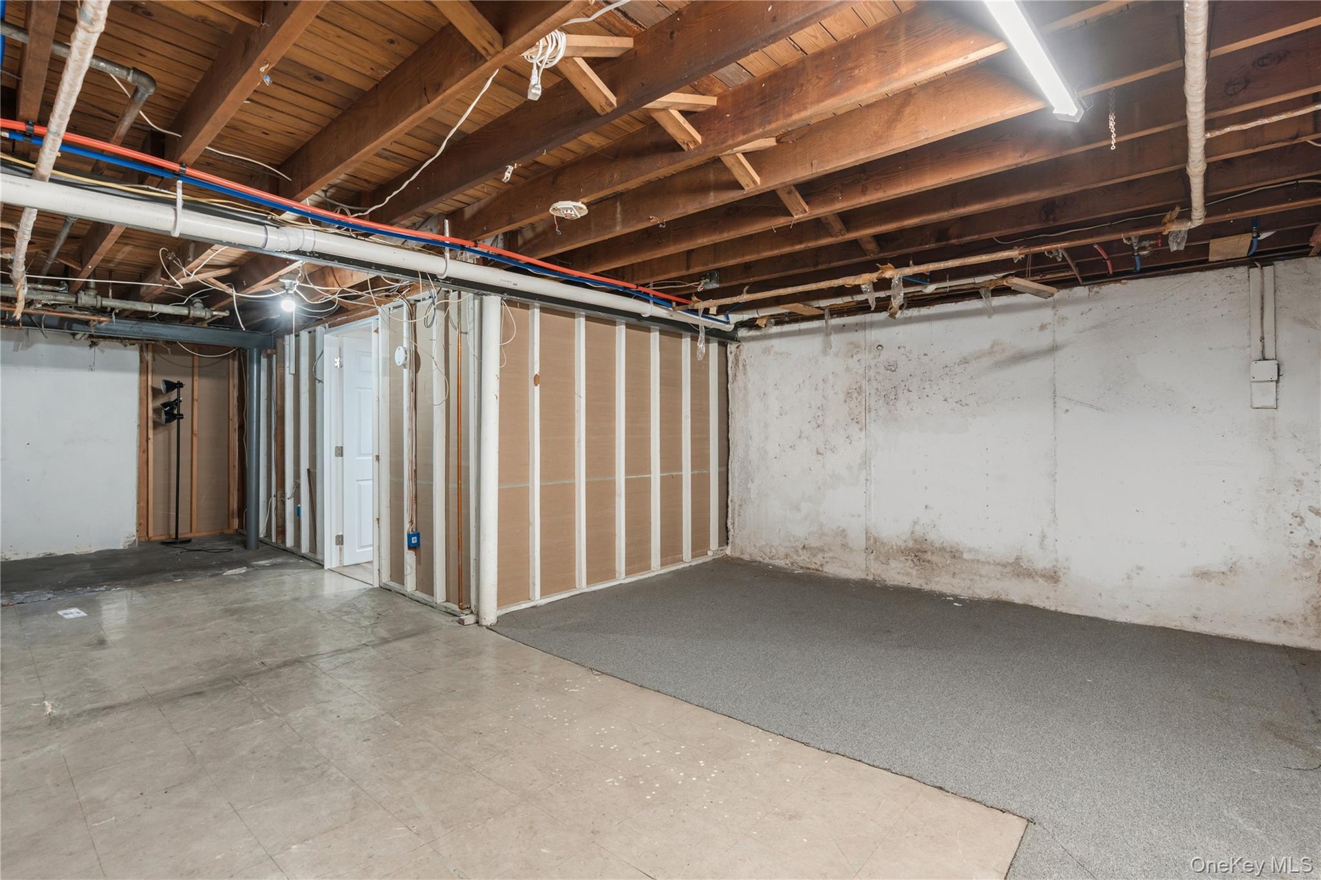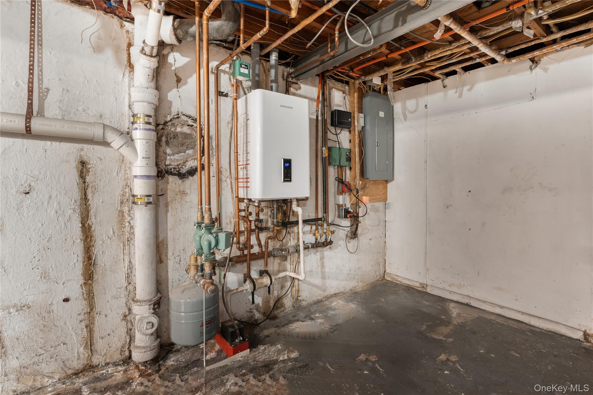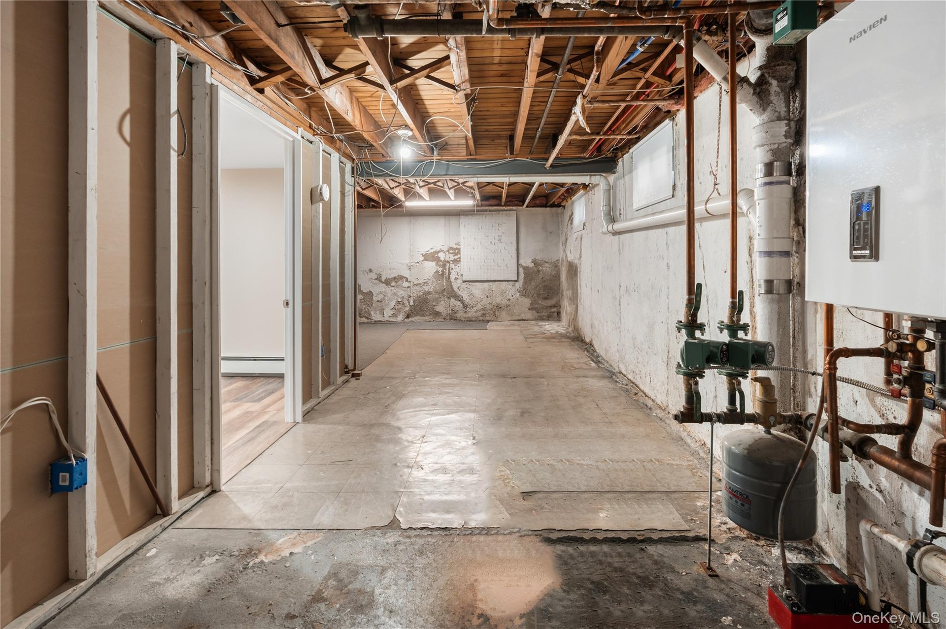- Unfinished below grade area featuring water heater and a baseboard heating unit
