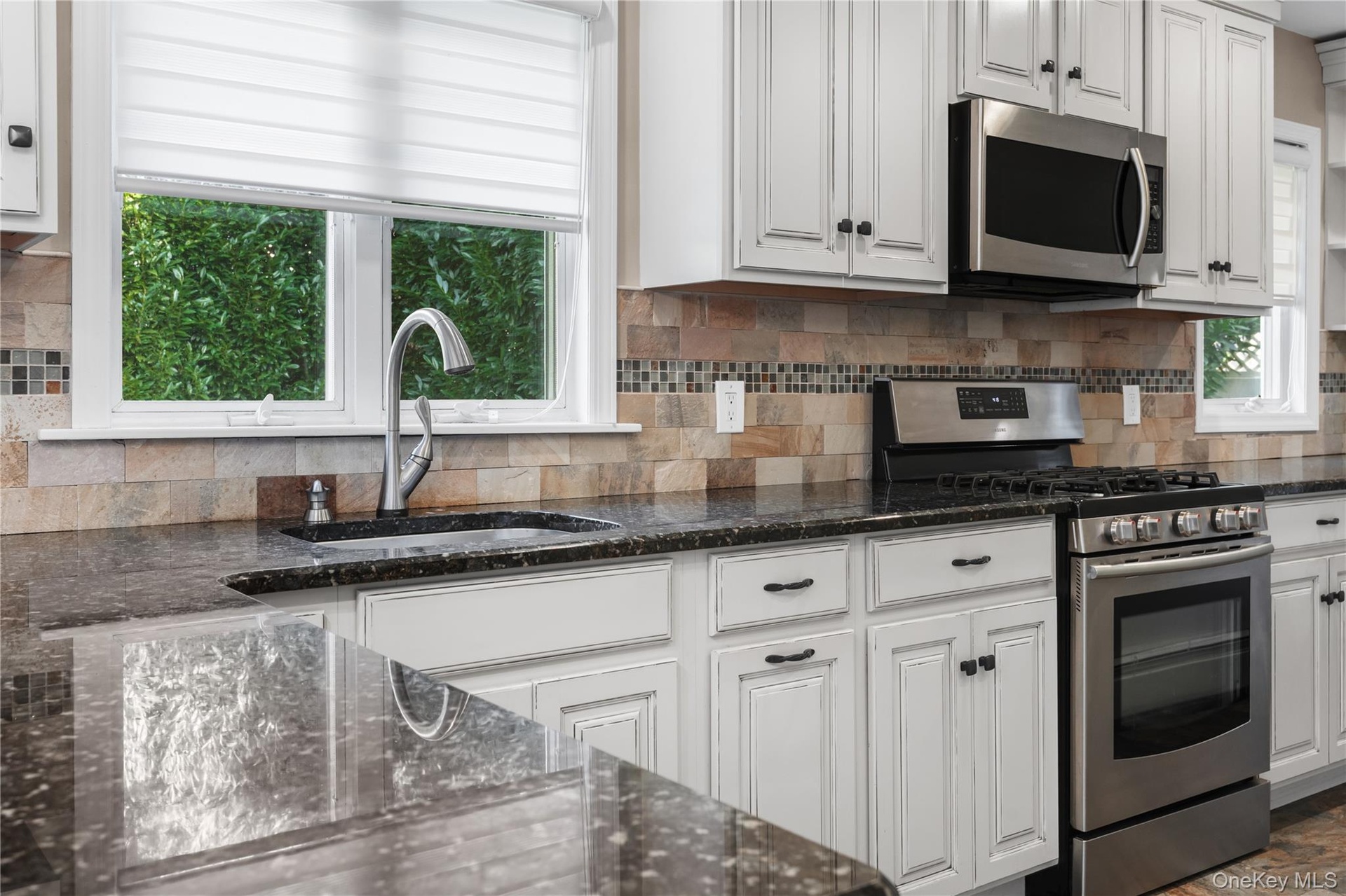 - Kitchen with appliances with stainless steel finishes, white cabinets, dark stone countertops, and backsplash