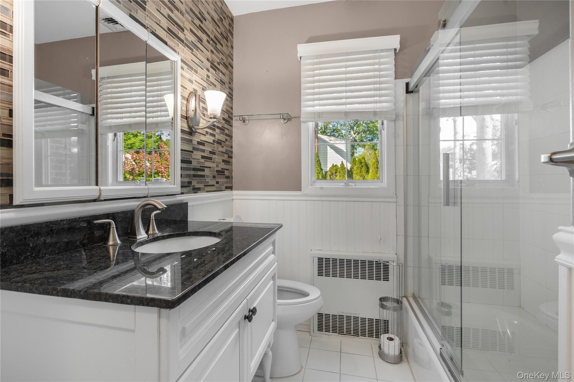 - Bathroom with radiator, bath / shower combo with glass door, vanity, healthy amount of natural light, and a wainscoted wall
