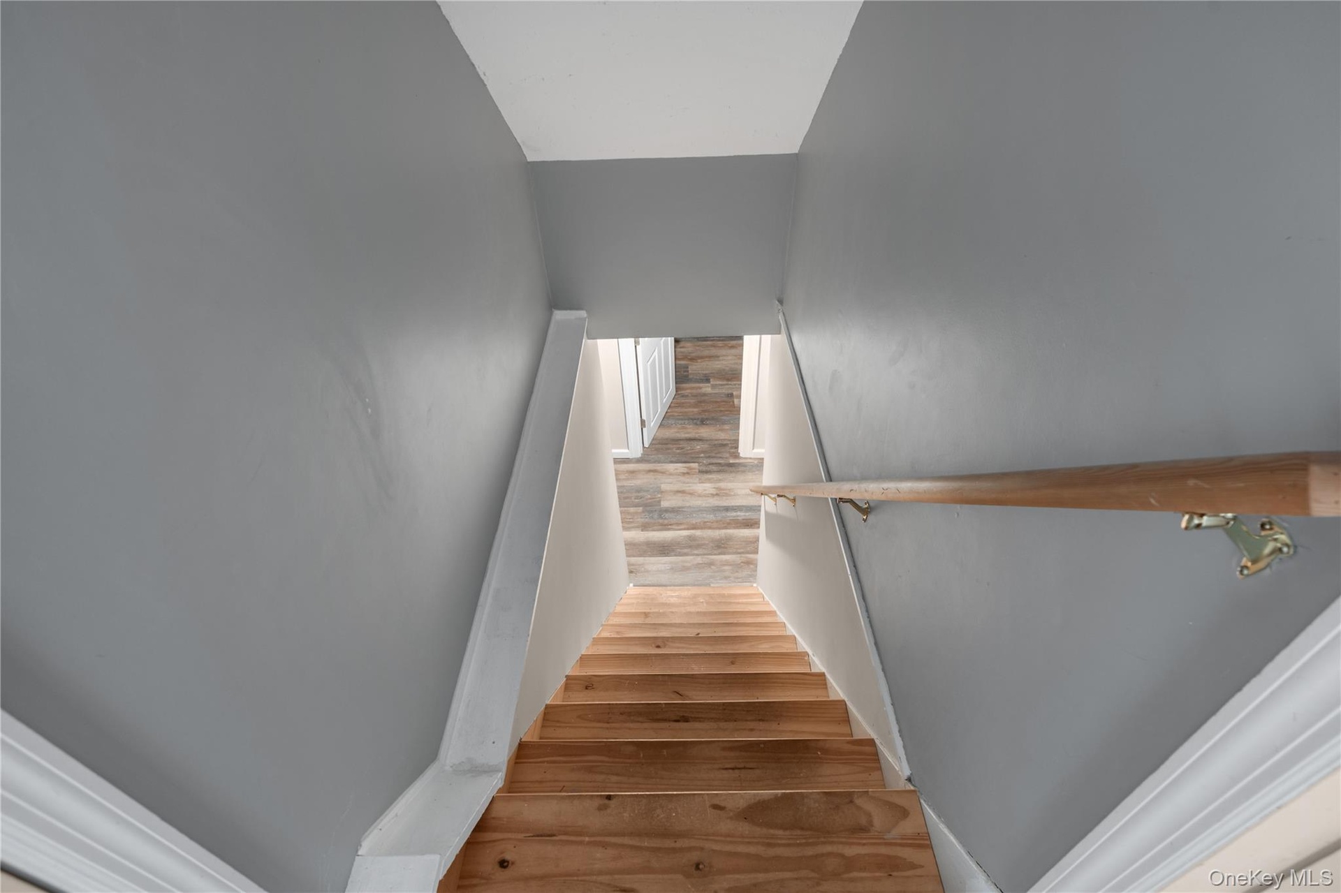 - Stairway featuring hardwood / wood-style flooring and vaulted ceiling