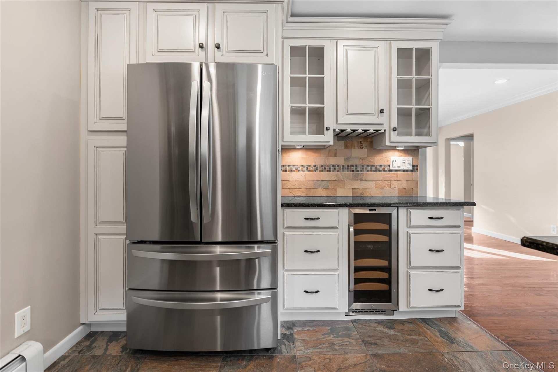 - Kitchen featuring glass insert cabinets, freestanding refrigerator, dark stone countertops, a baseboard radiator, and beverage cooler