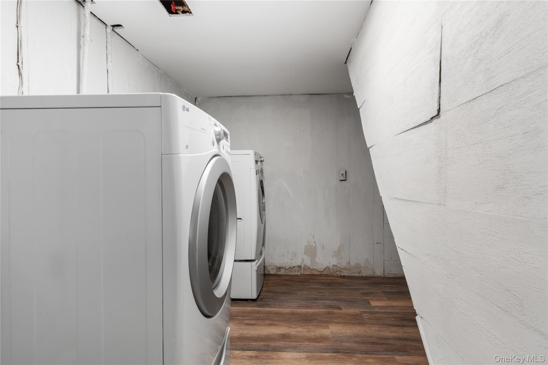 - Washroom featuring dark wood-style floors and washing machine and clothes dryer
