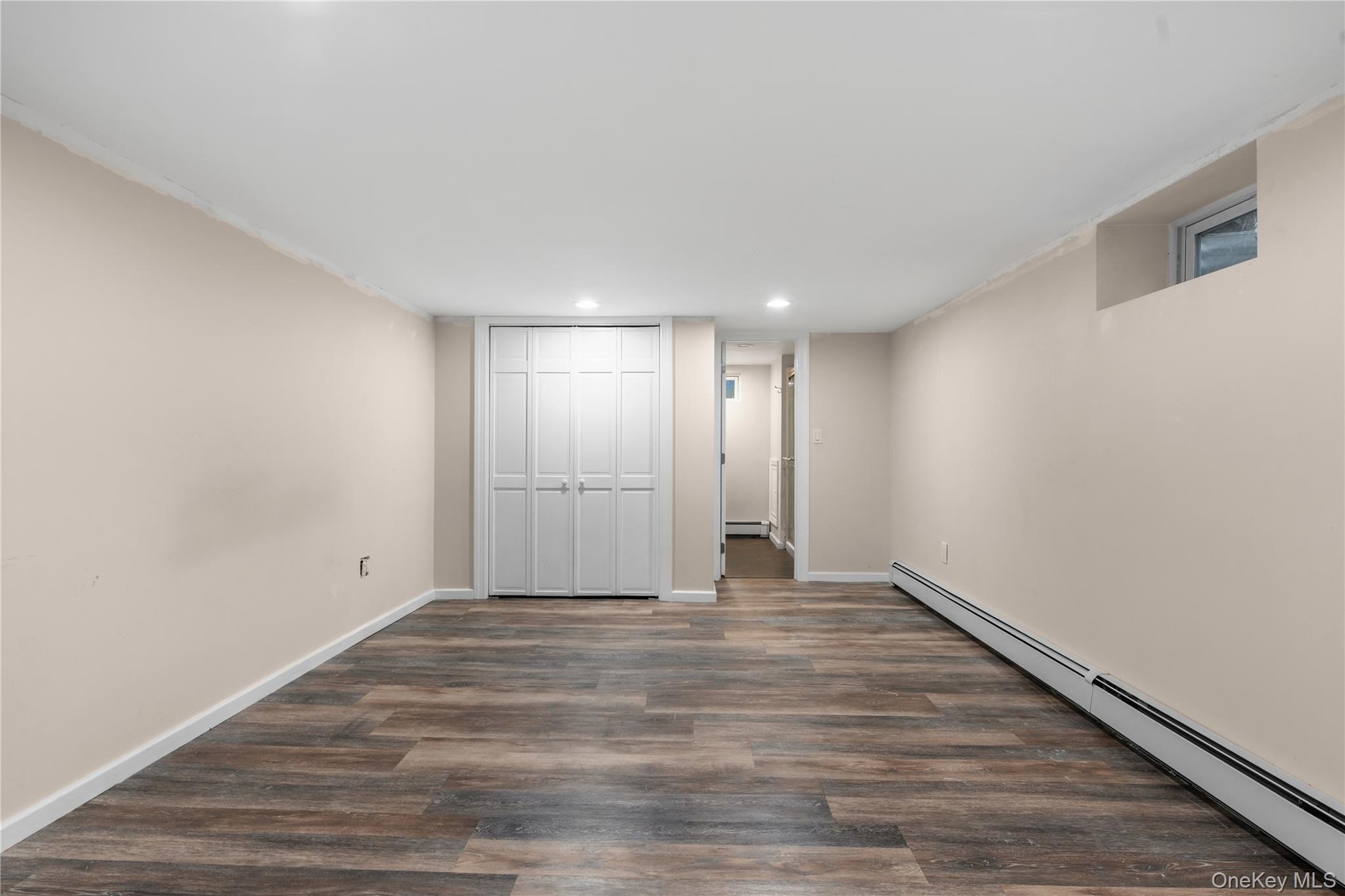 - Unfurnished room with a baseboard heating unit, recessed lighting, and dark wood-style floors
