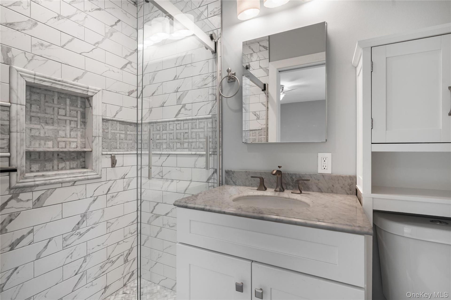 - Bathroom featuring vanity, a stall shower, a baseboard radiator, and wood tiled floors