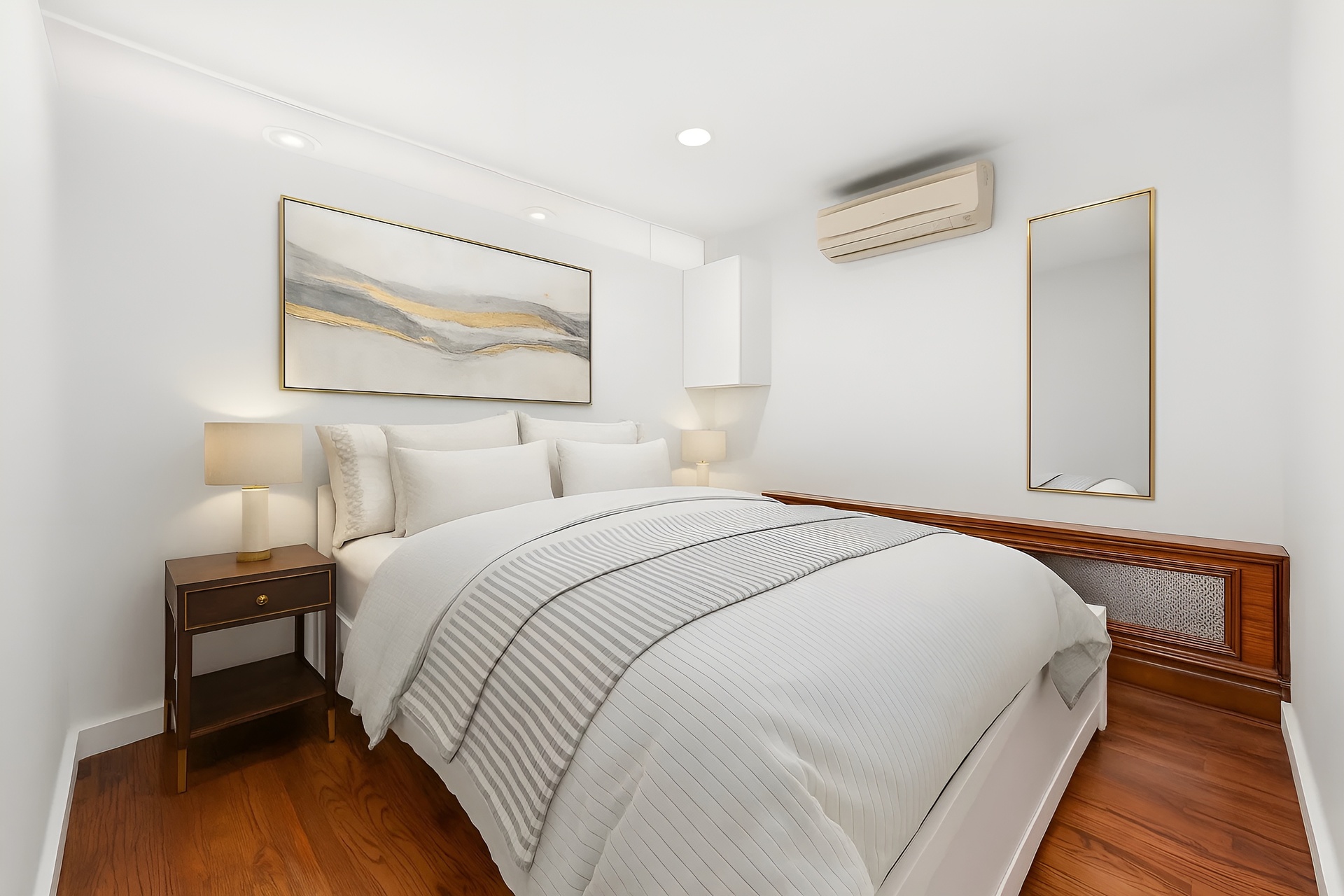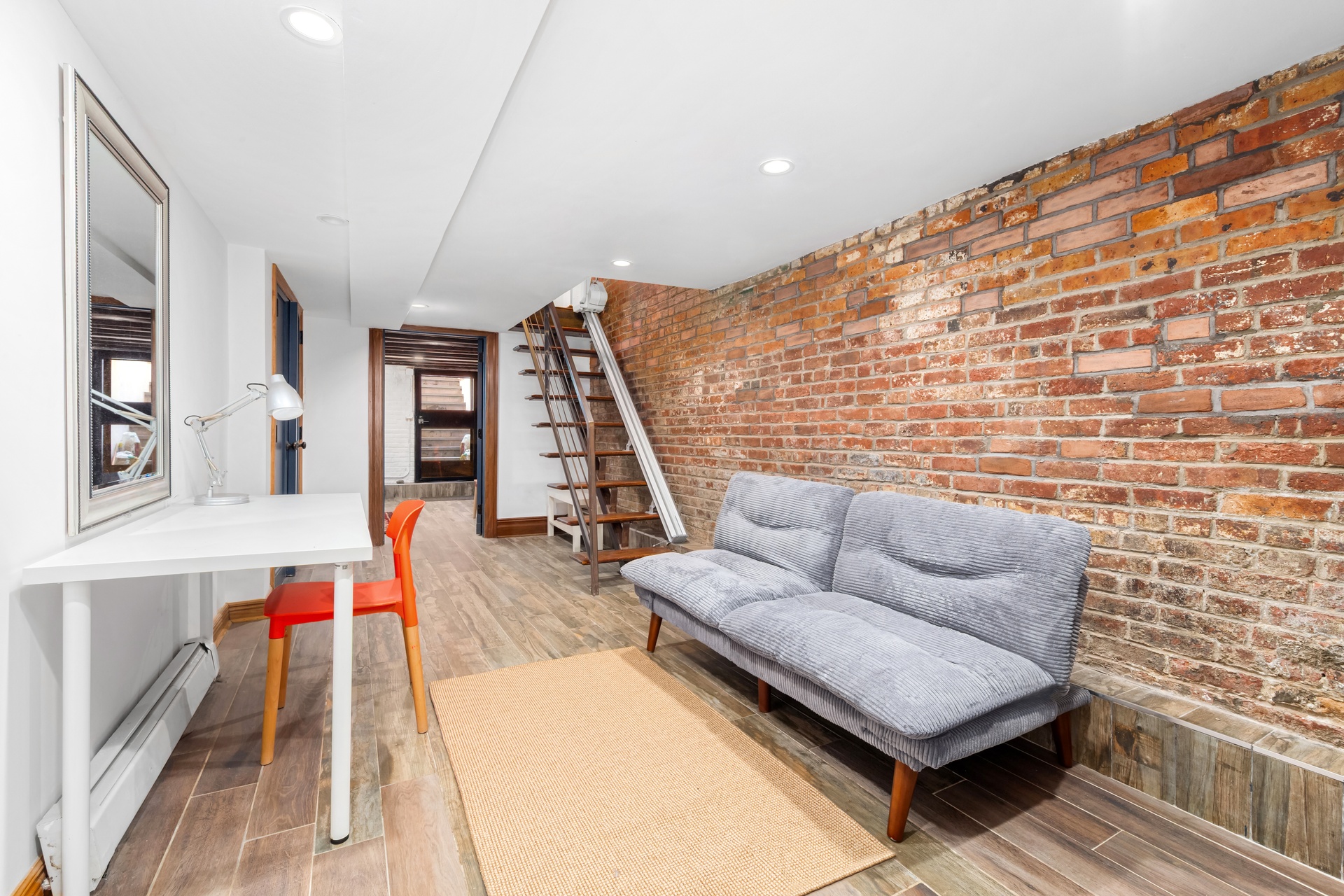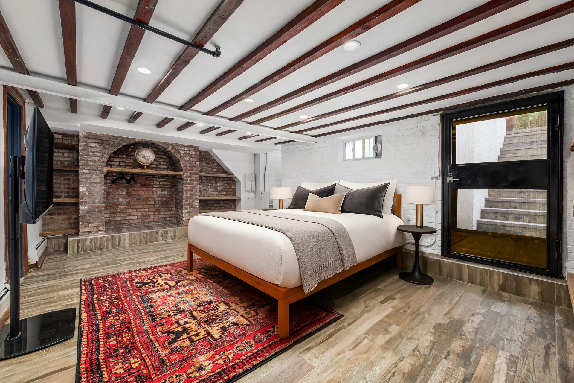 Upstairs, you’ll find a furnished bedroom with a queen-size bed, nightstands, and shelving, complete with its own HVAC unit. A modern floating staircase, equipped with a stair lift for residents (available with no liability), leads to the primary suite on the lower level, where charming exposed beams and brick walls set a cozy tone. This room includes a queen-size bed, ample shelving, clothing racks, a flat-screen TV, and an en-suite bathroom.