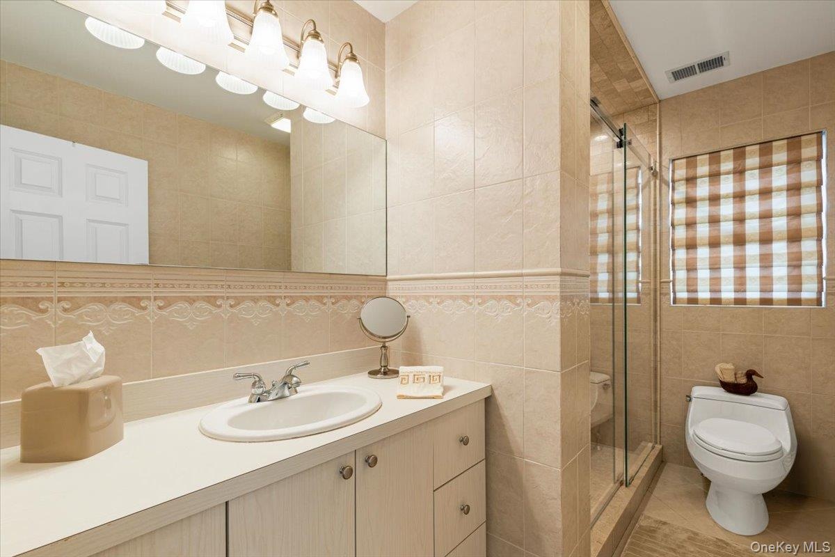 - Bathroom featuring tile walls, vanity, a shower stall, tile patterned floors, and decorative backsplash