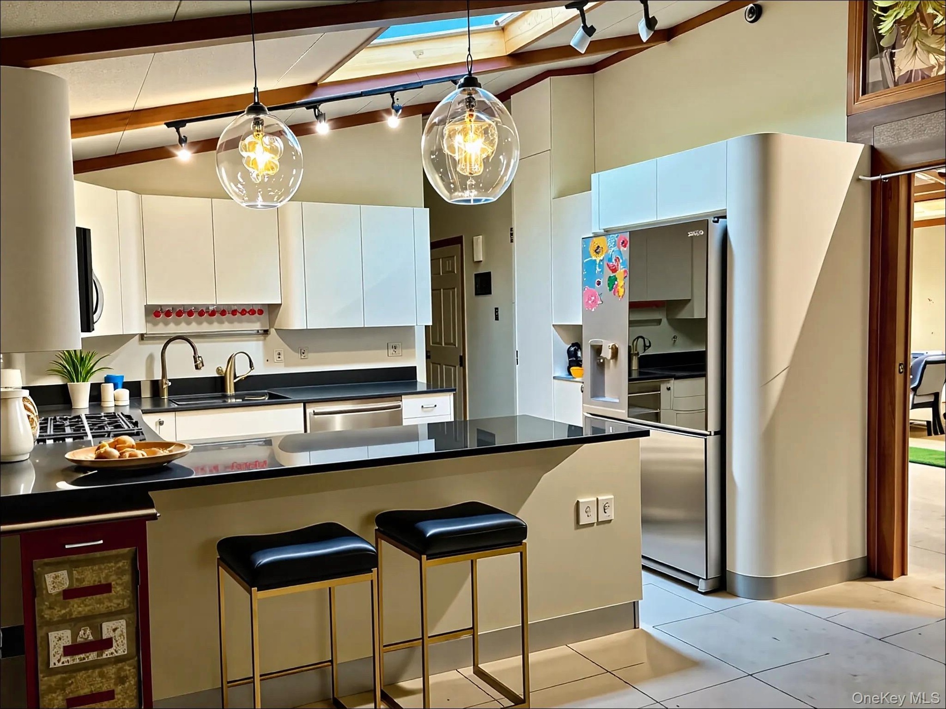 The home boasts stunning curb appeal and an immaculate interior that will make you feel right at home upon entering. The Hi Ranch dining room flows seamlessly into the gorgeous kitchen, featuring white wood cabinets, quartz countertops, stainless steel appliances, and a skylight for natural light. The cozy living room offers ample space for family gatherings, while the ample family room with a fireplace and a sliding door leads to a huge deck.