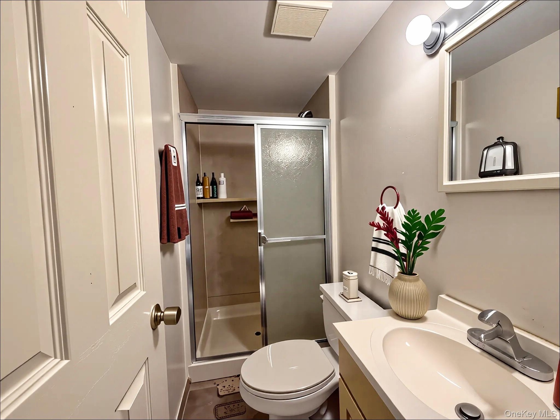 - Bathroom with a shower stall, vanity, and dark tile patterned floors