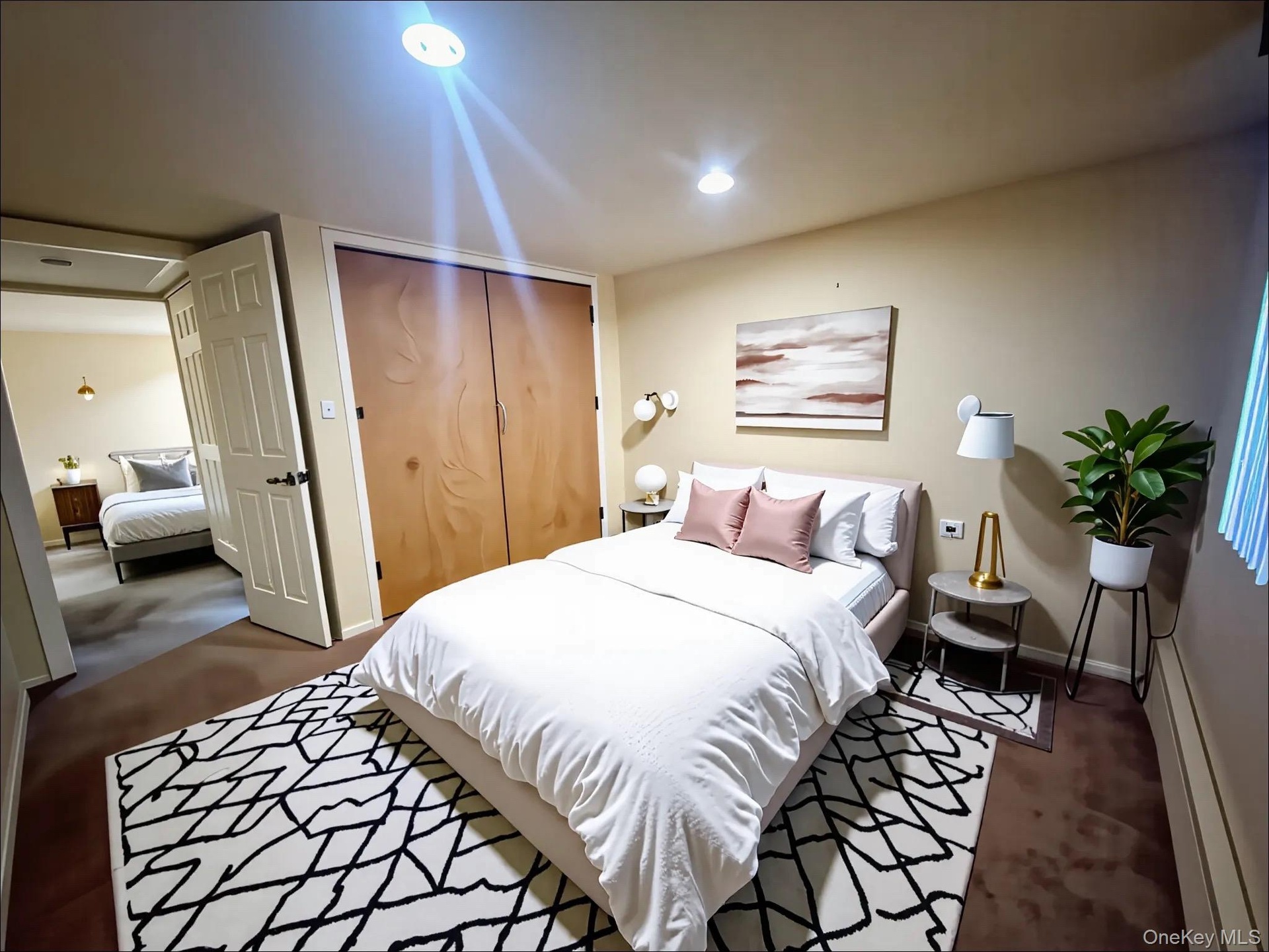 - Bedroom with a baseboard heating unit, dark carpet, a closet, and recessed lighting