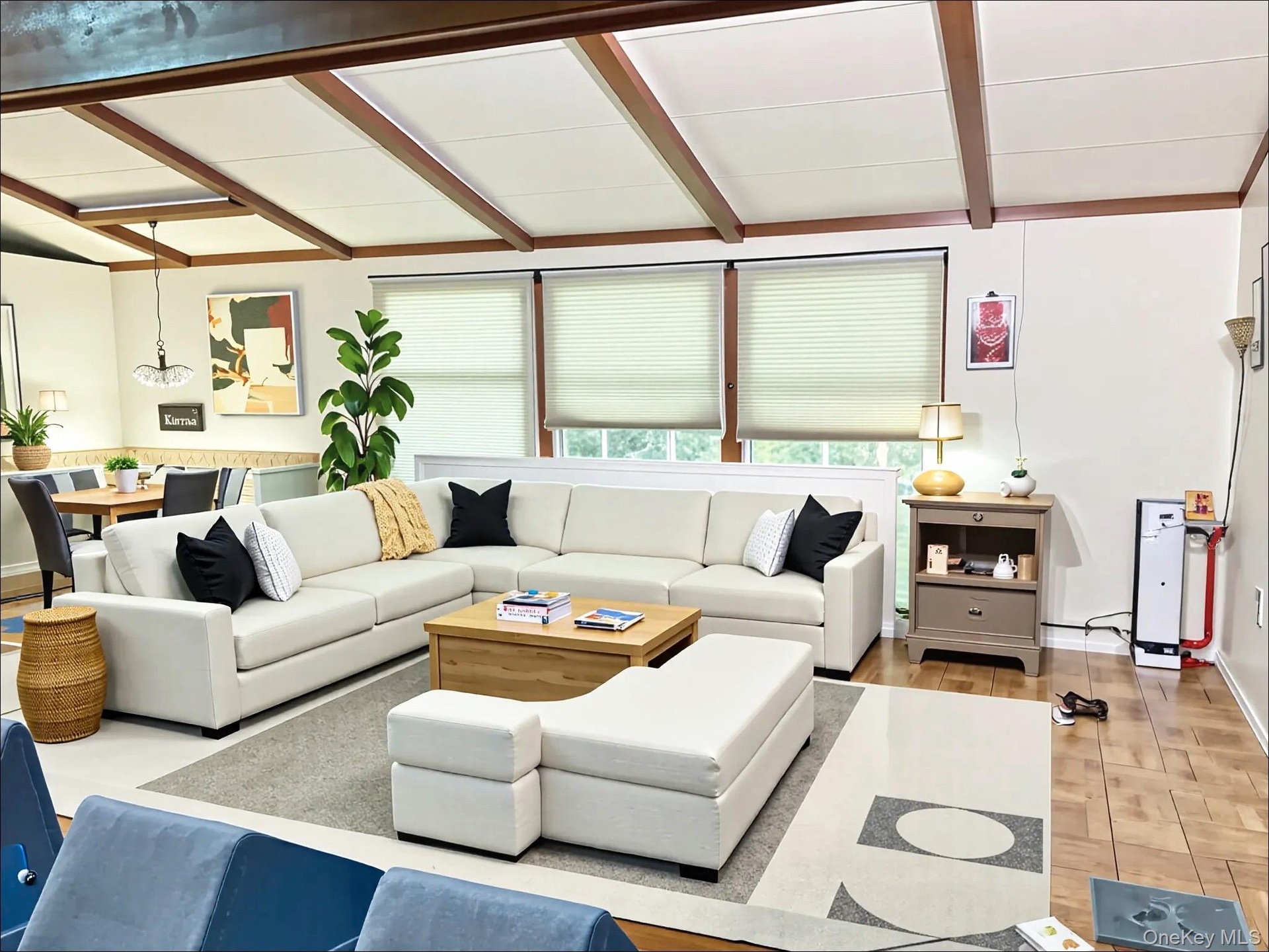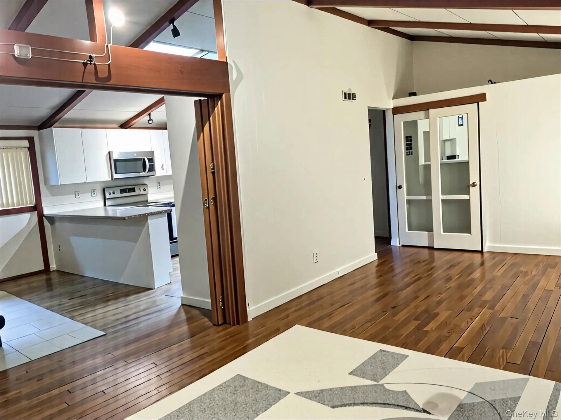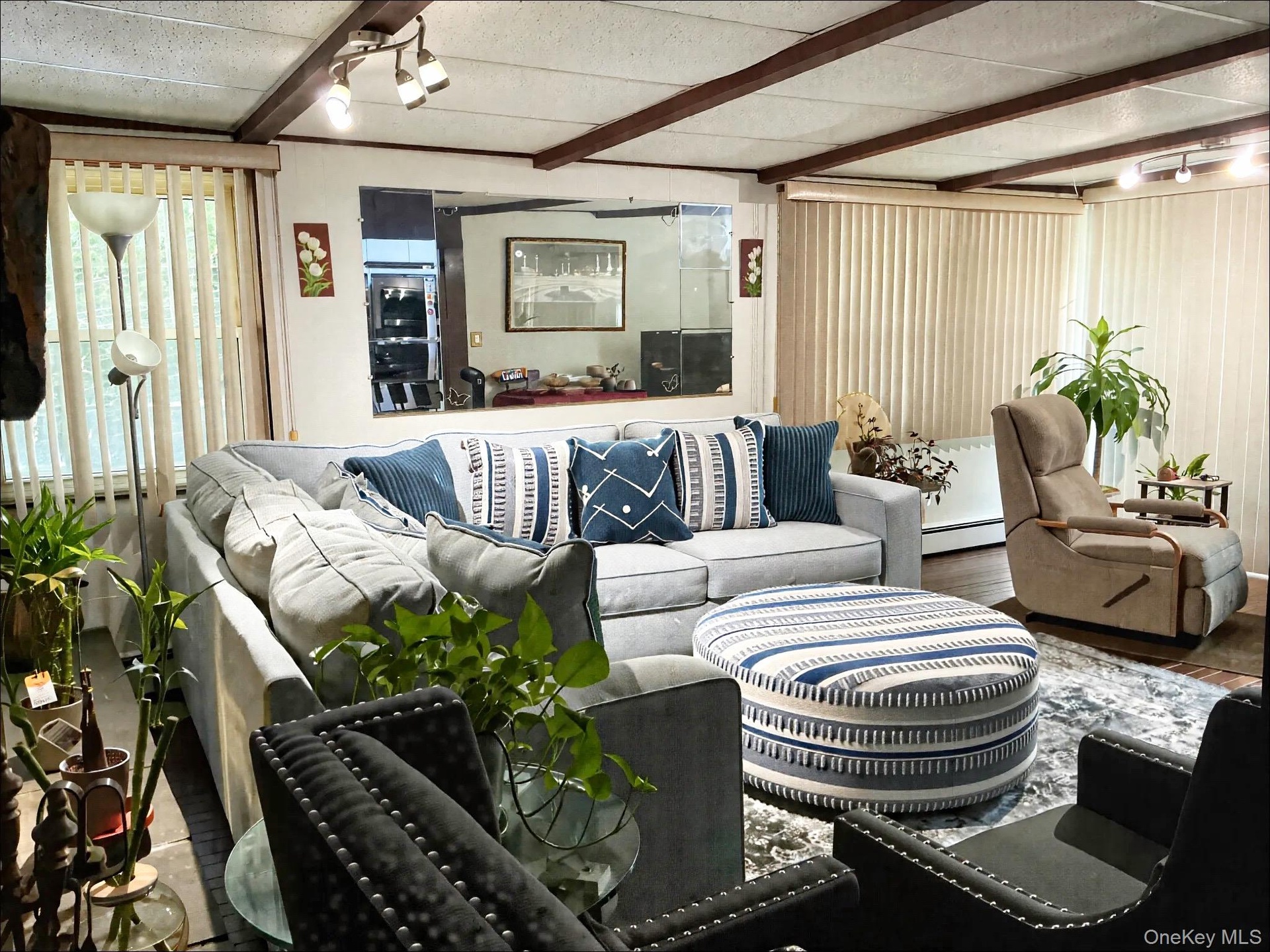 - Living area with wood finished floors, beam ceiling, and baseboard heating