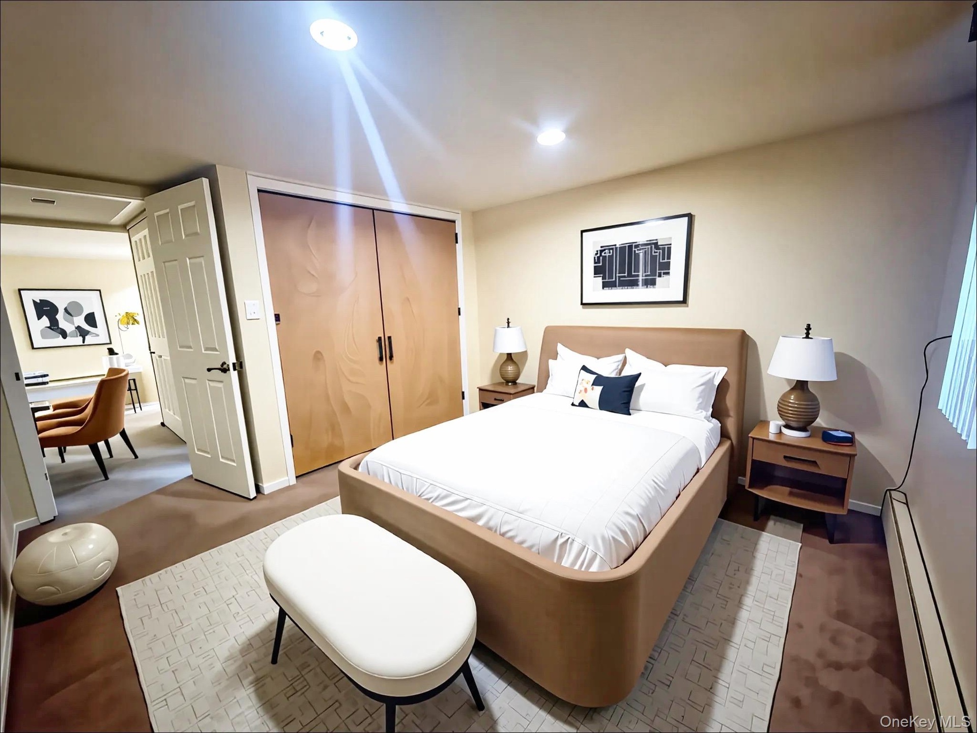 - Carpeted bedroom featuring a baseboard heating unit, a closet, and recessed lighting