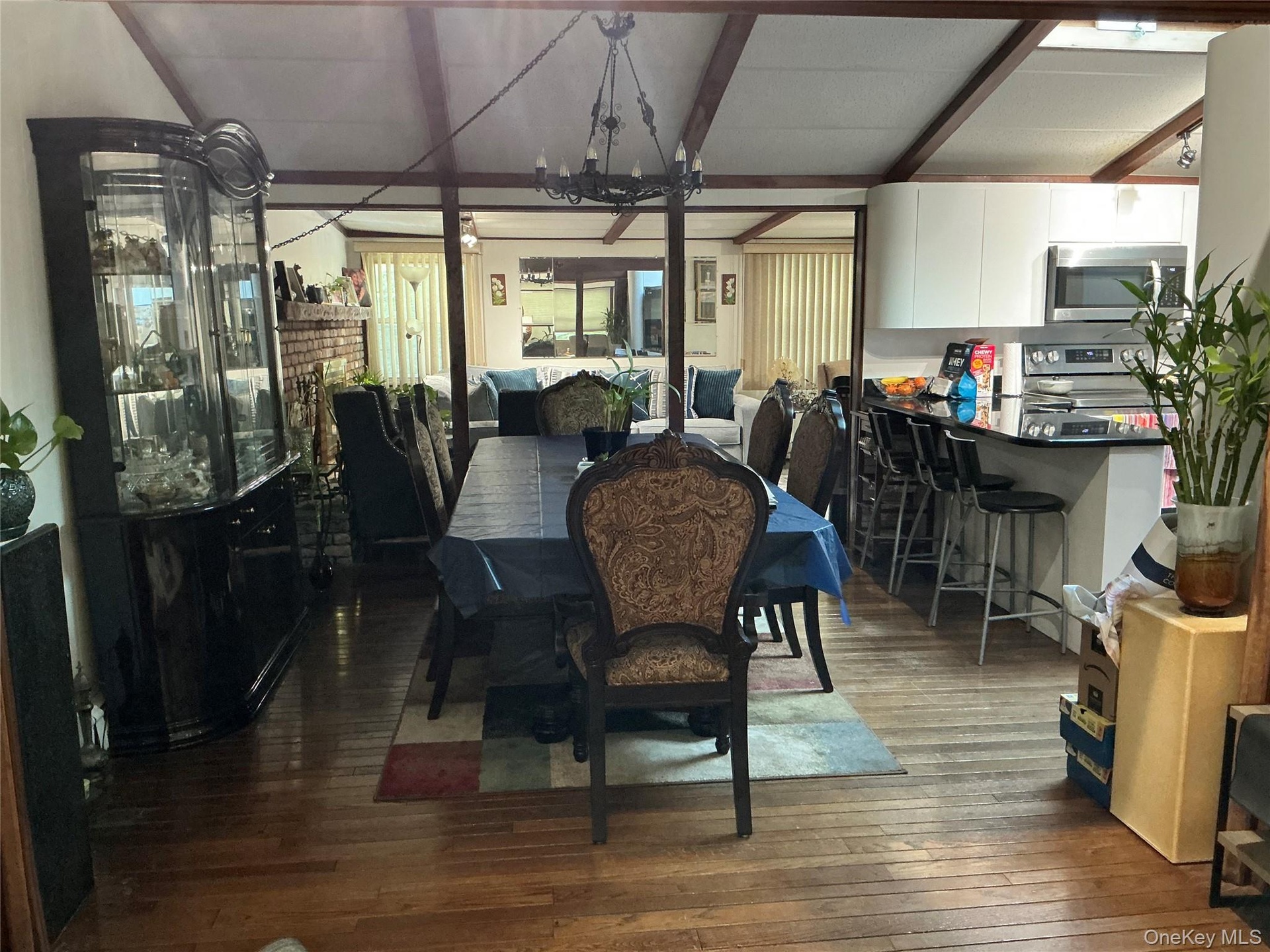 - Dining room featuring dark wood-style flooring, a chandelier, and beam ceiling