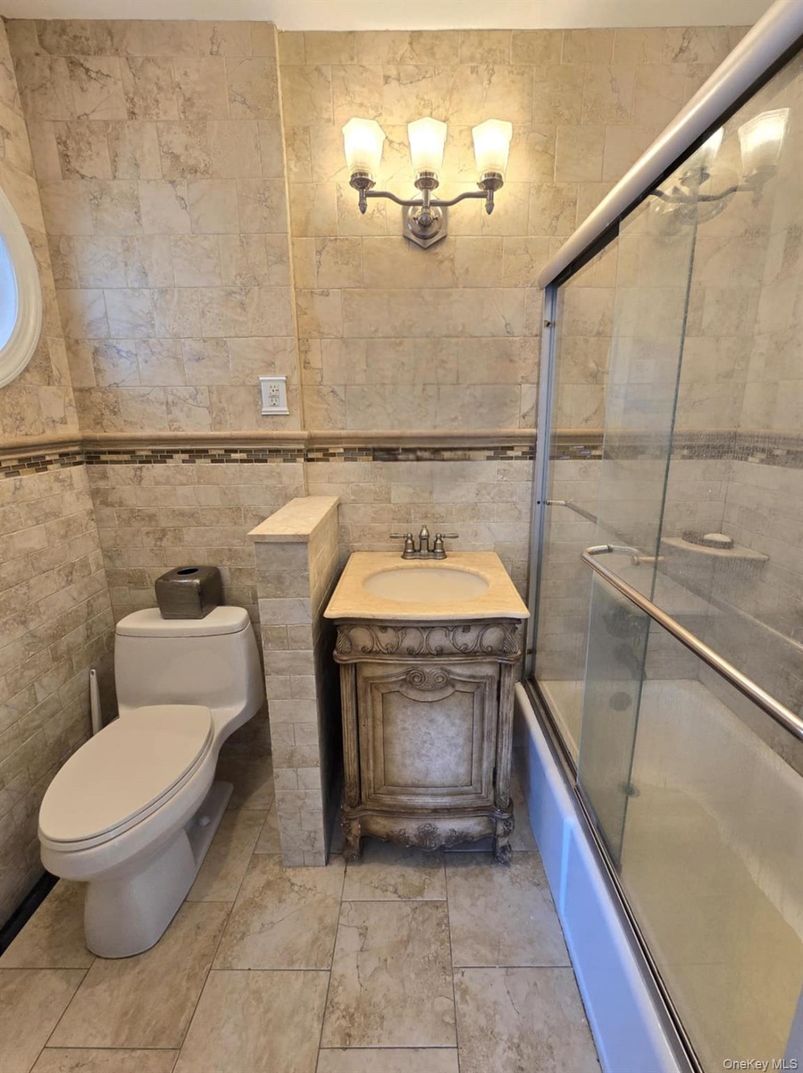 - Bathroom with shower / bath combination with glass door, tile walls, and vanity