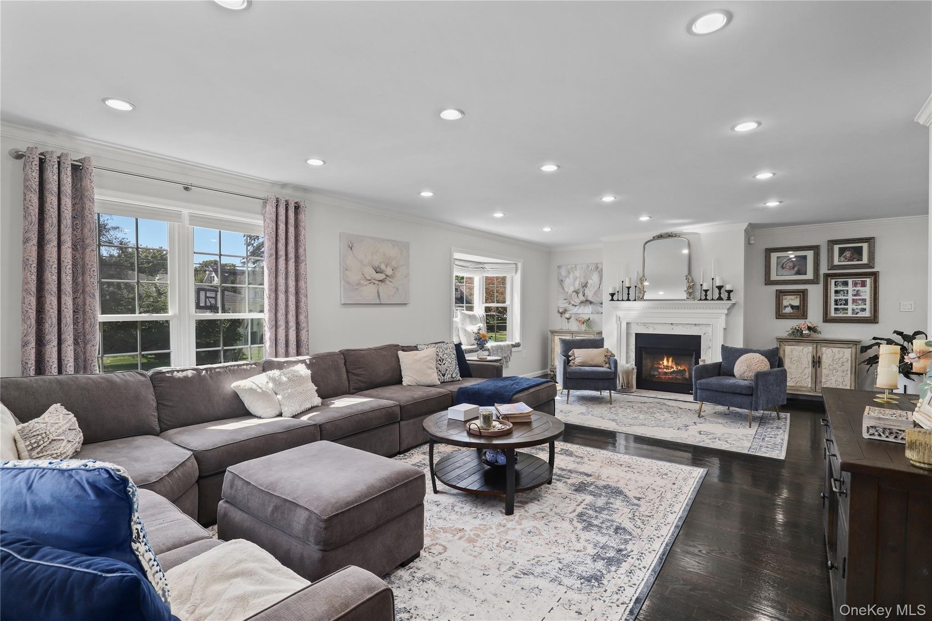 - Living area featuring crown molding, recessed lighting, a warm lit fireplace, and dark wood finished floors