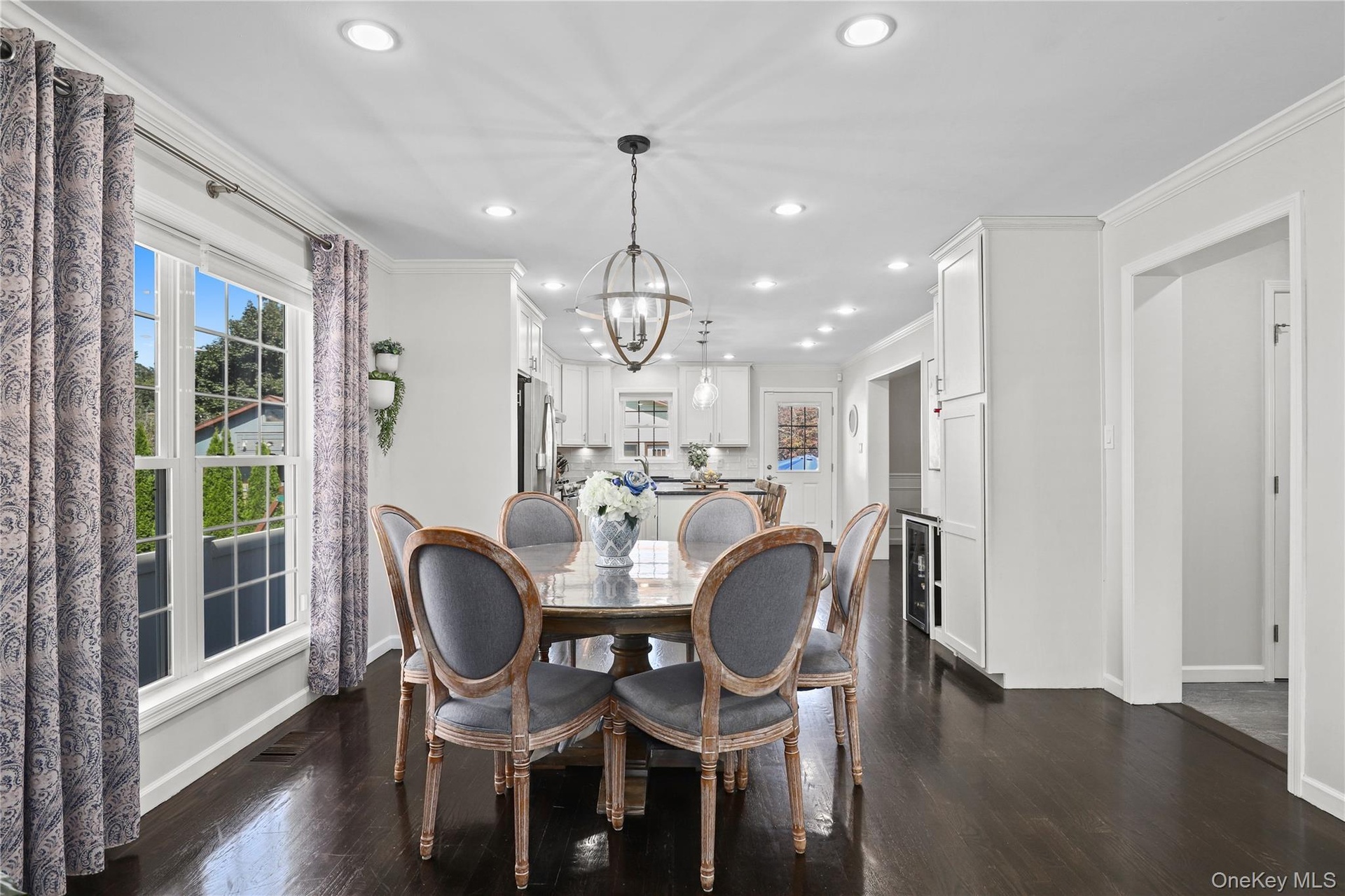 - Dining area with ornamental molding, dark wood-style floors, recessed lighting, a chandelier, and wine cooler