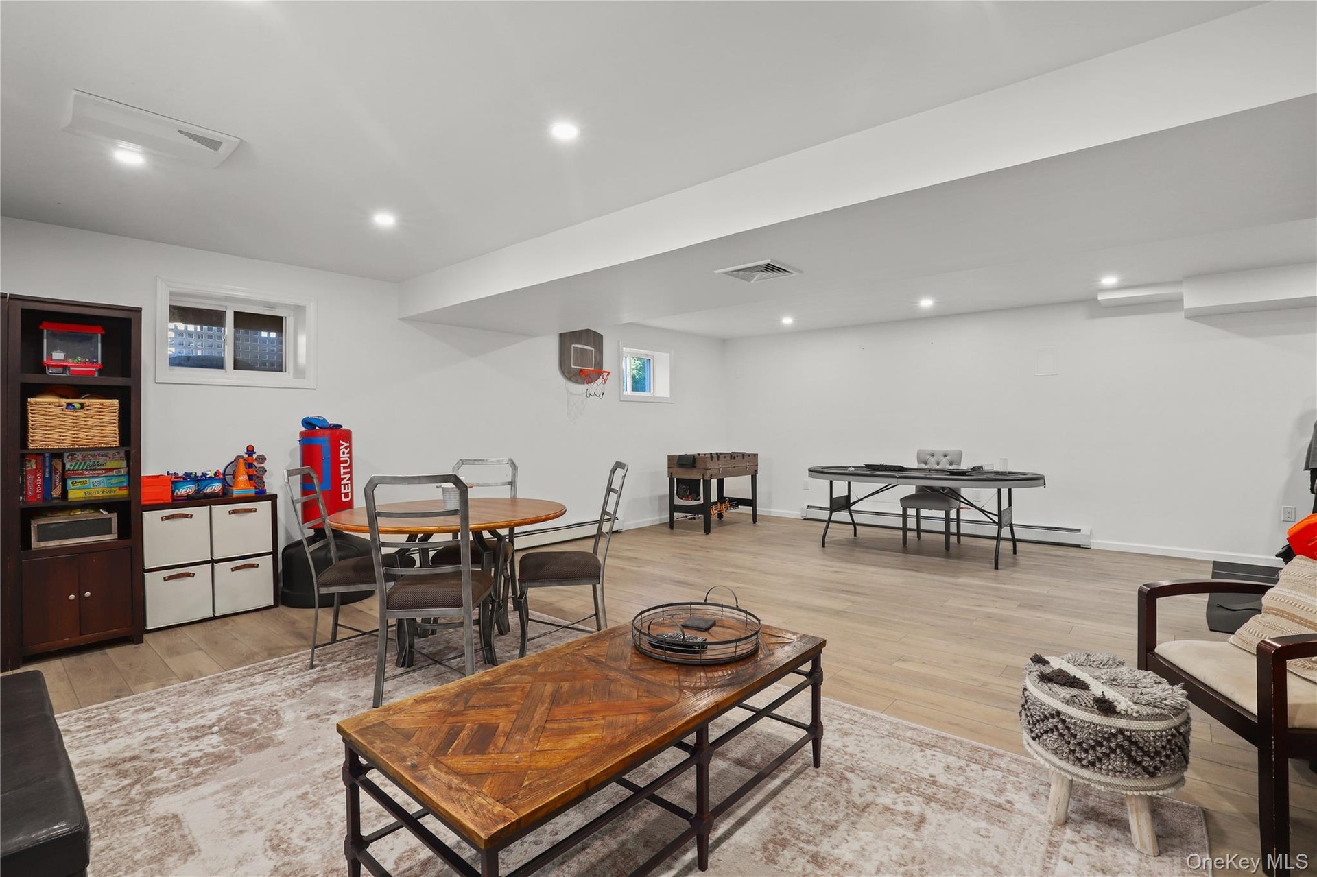 - Entertainment space with baseboard heating, recessed lighting, and light wood finished floors