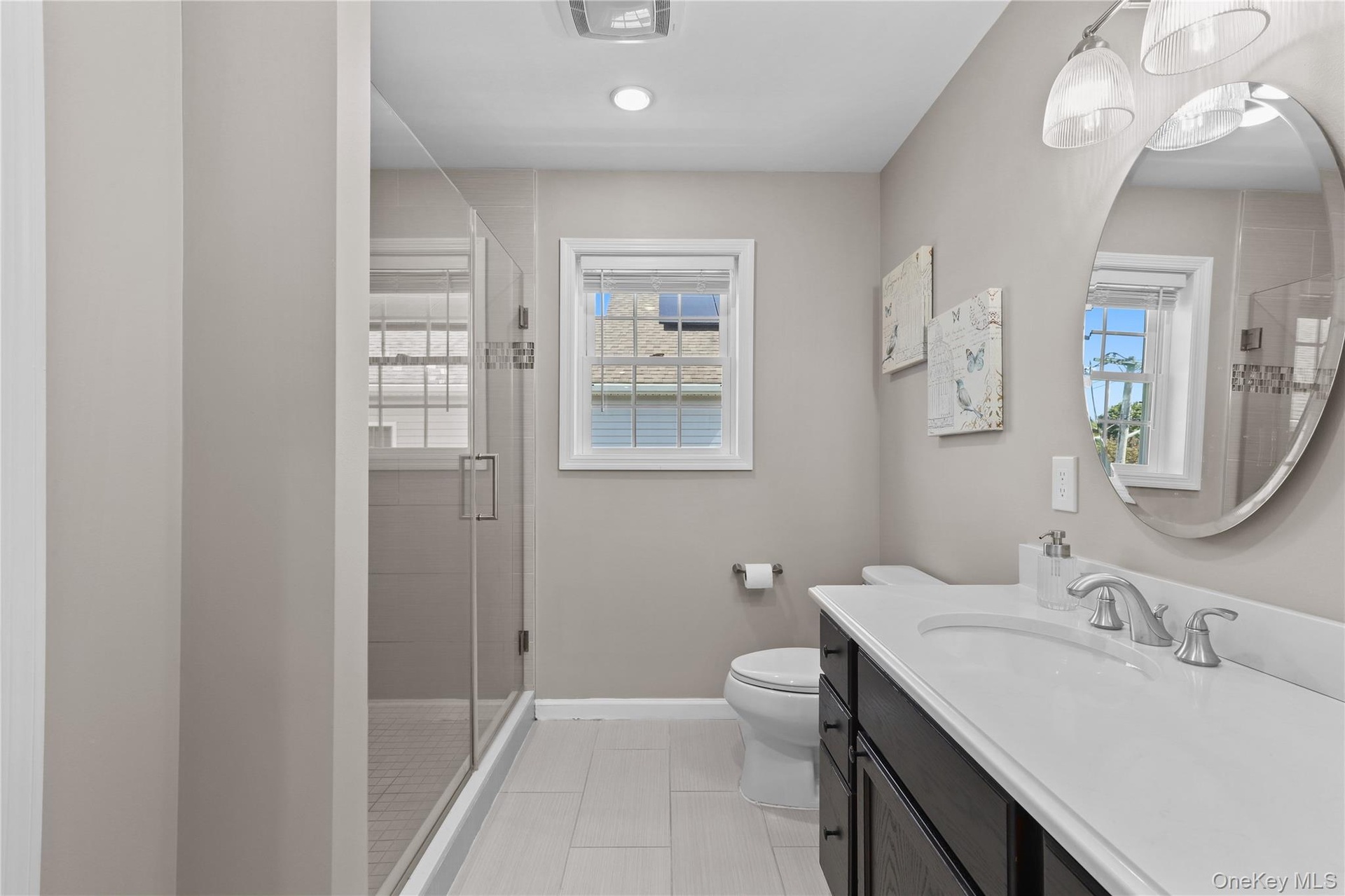 - Main Bathroom featuring a stall shower, vanity, and light tile patterned floors