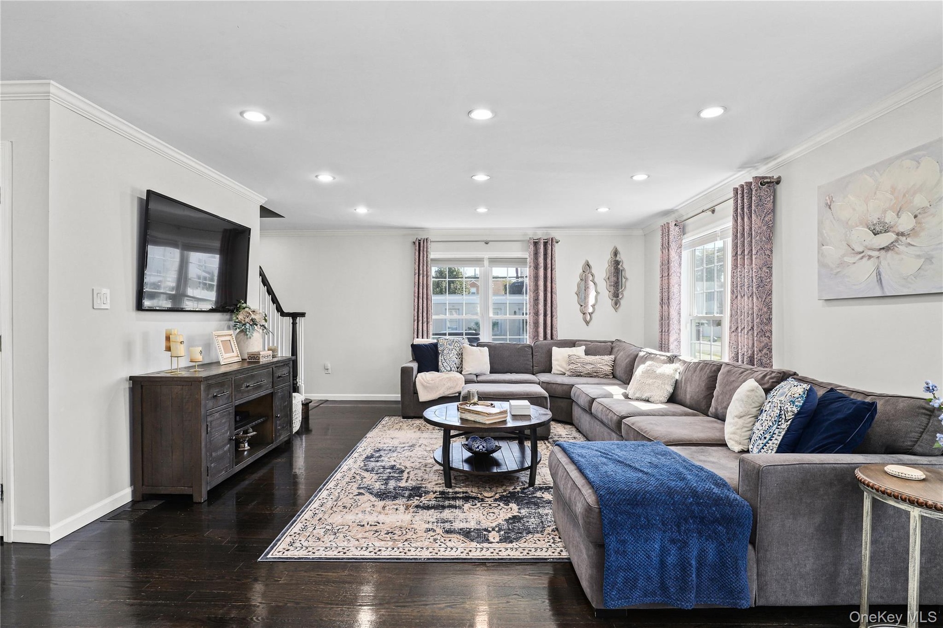 - Living area with dark wood-style floors, recessed lighting, ornamental molding, and stairway