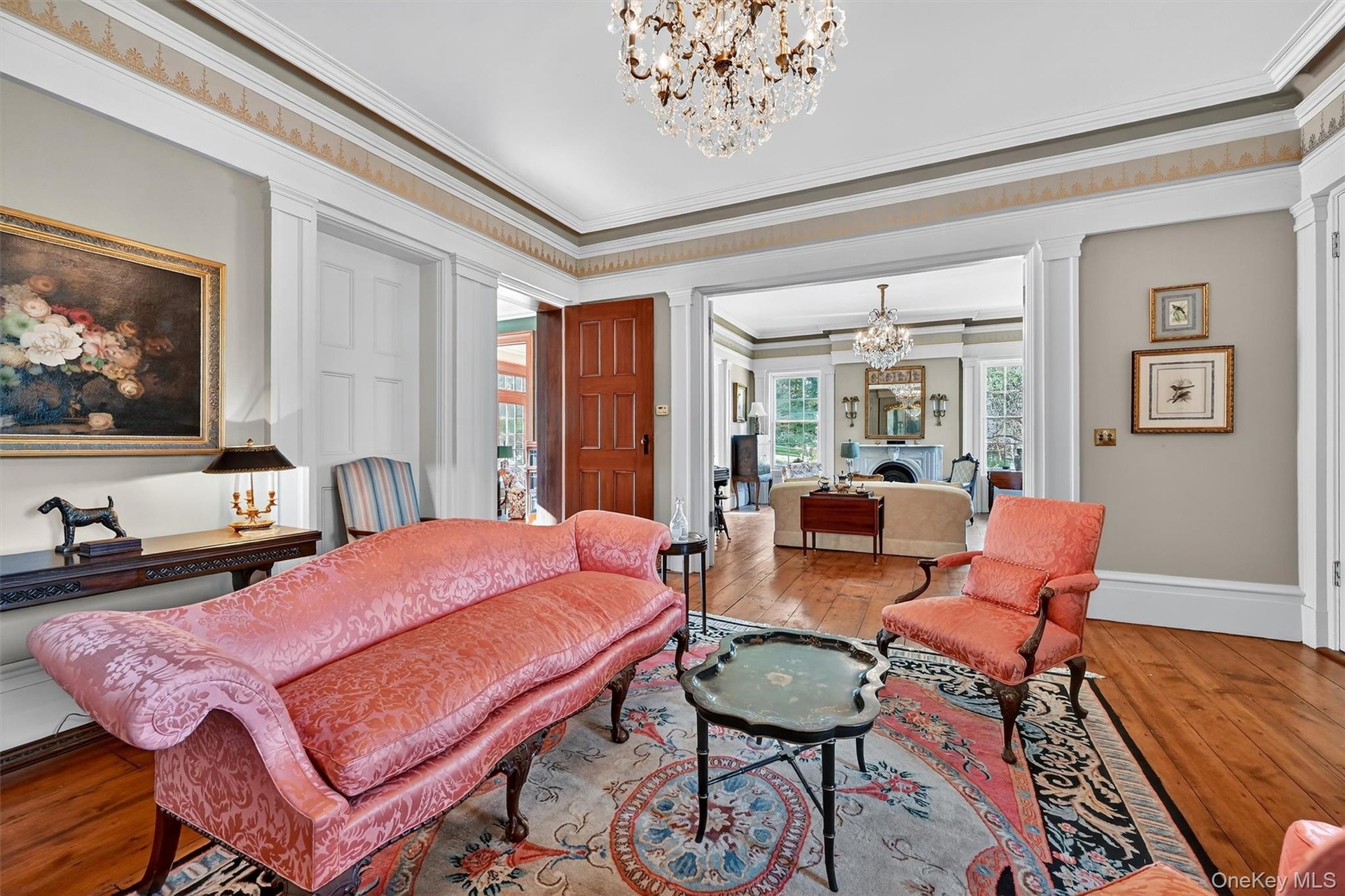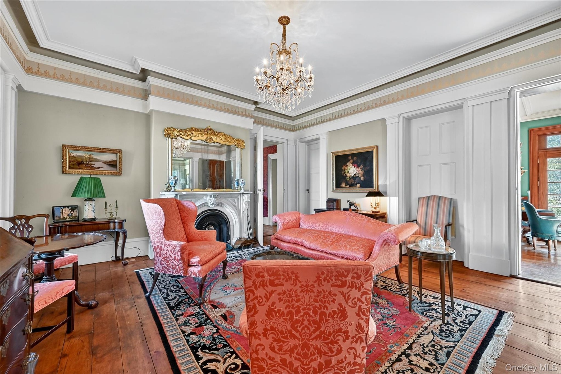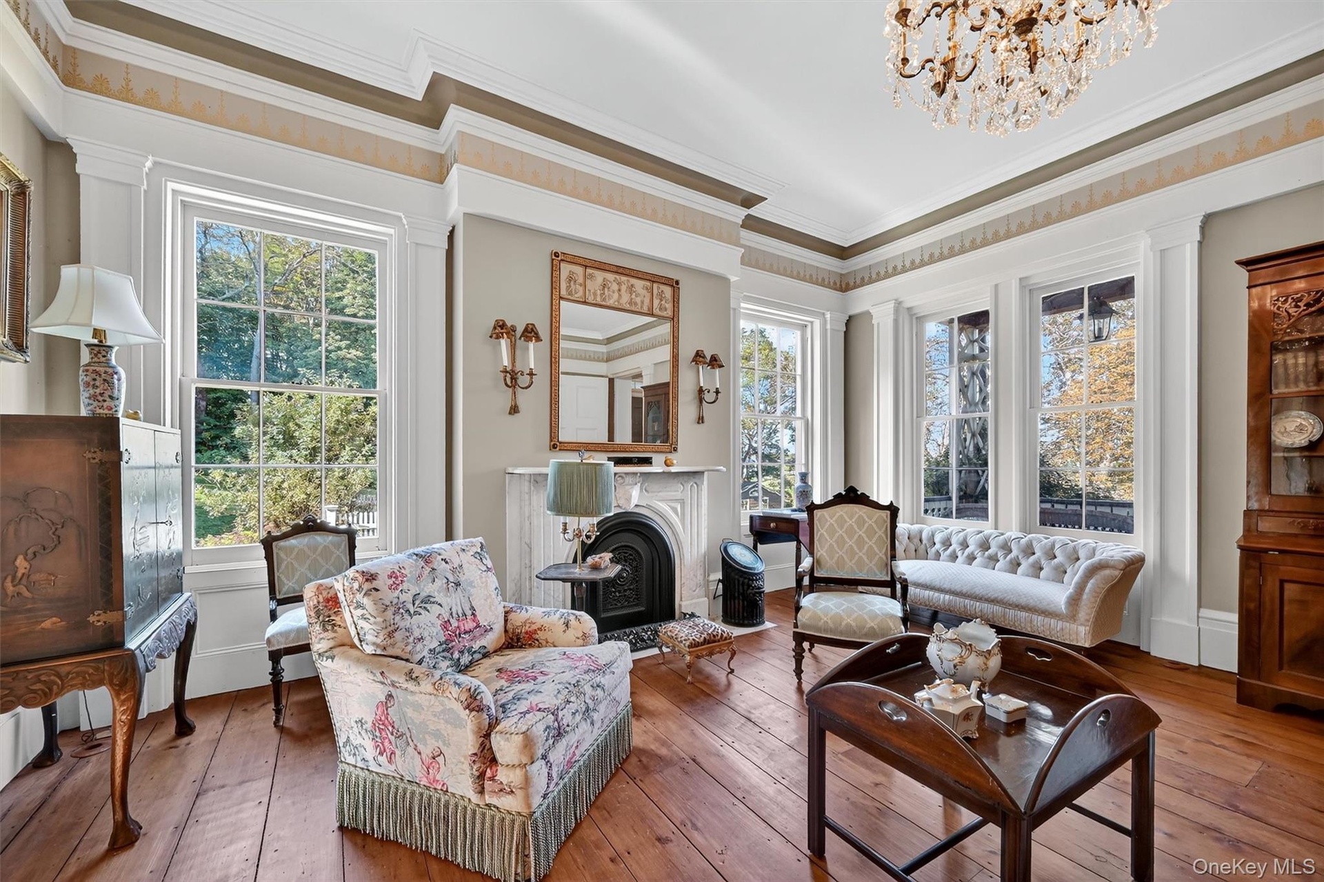 - Grand entries lead you into this sitting room, where historic charm is alive in the carved fireplace, gleaming wide-plank floors, and glittering chand