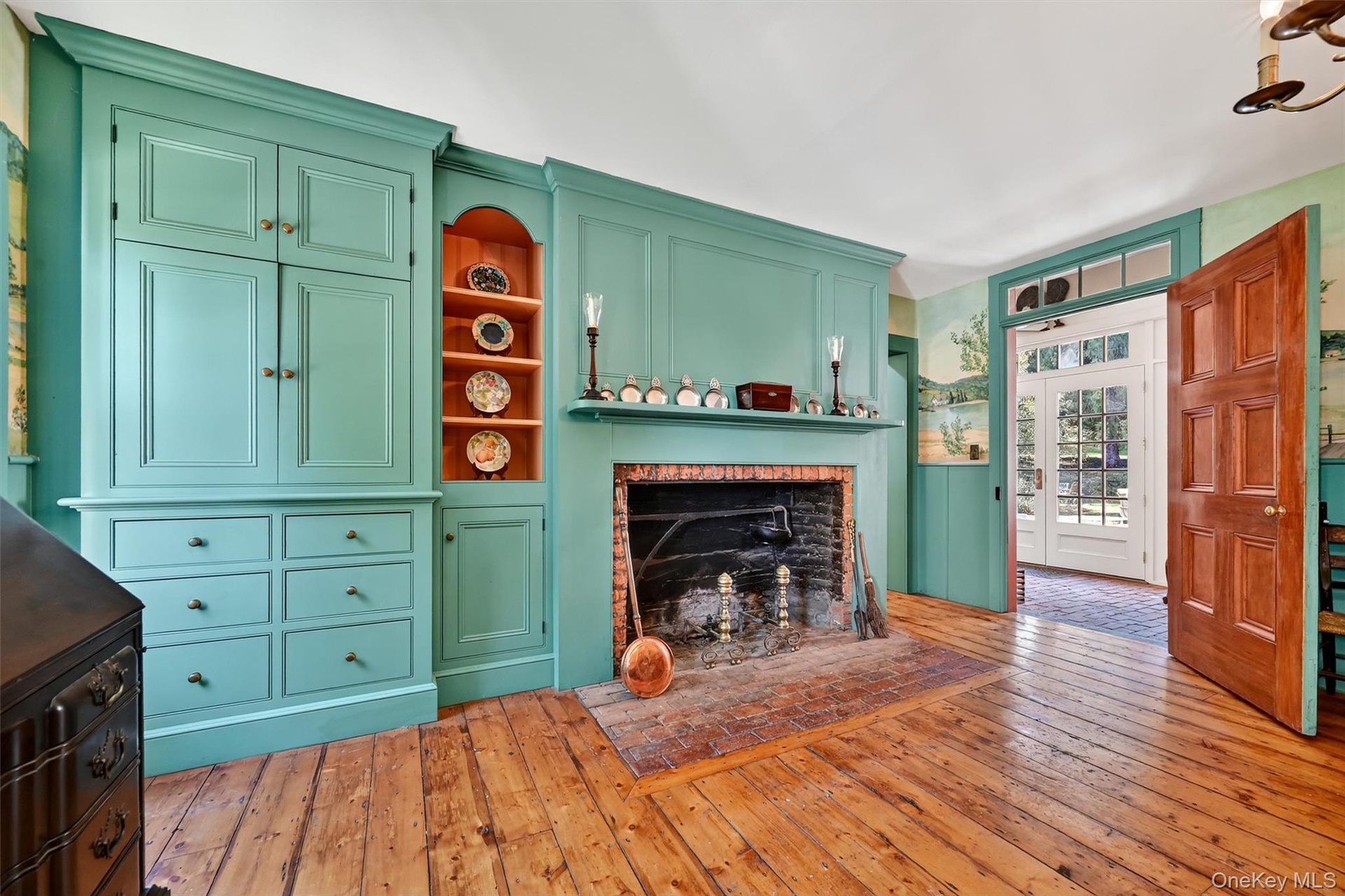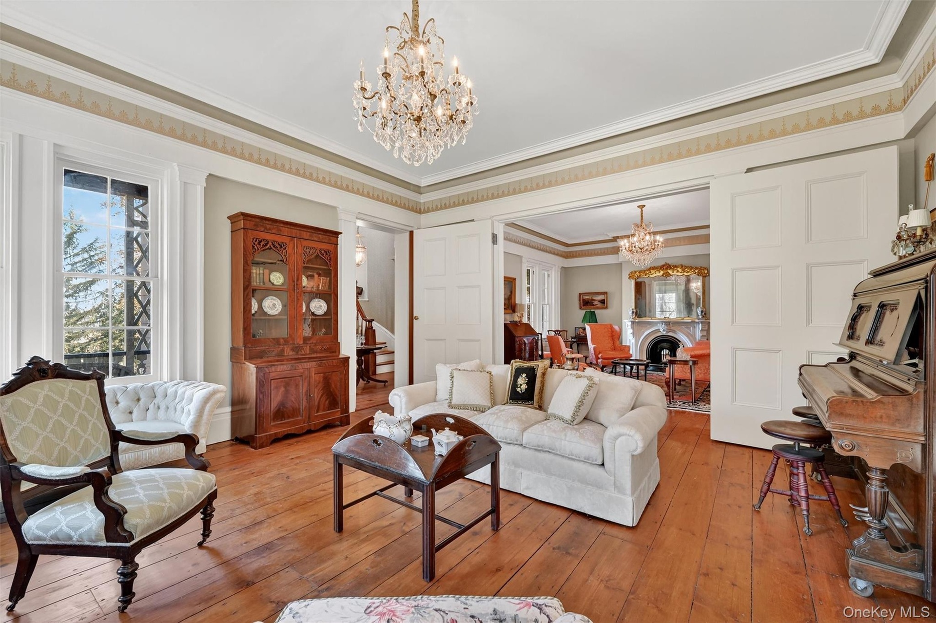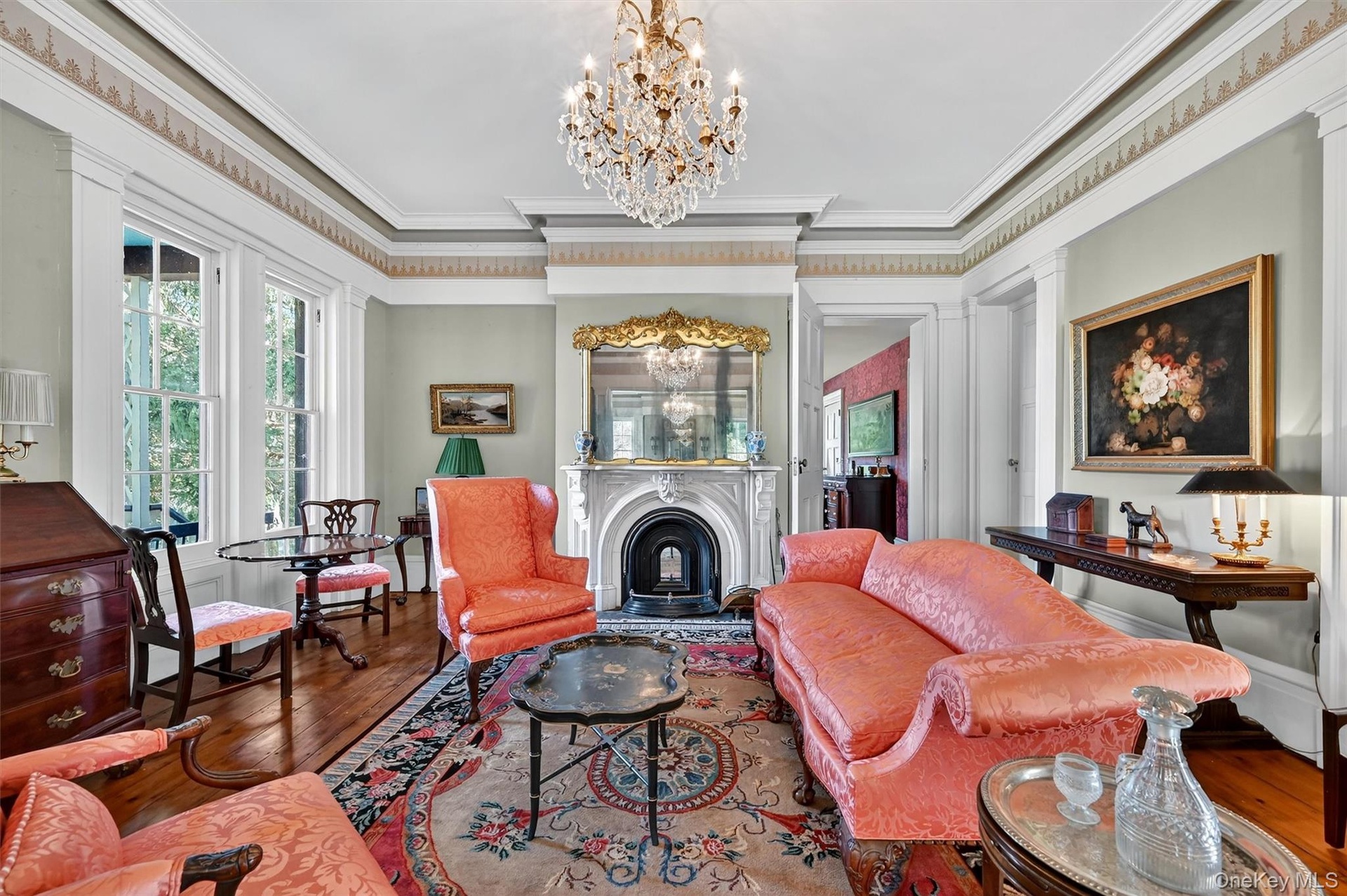- Grand entries lead you into this sitting room, where historic charm is alive in the carved fireplace, gleaming wide-plank floors, and glittering chand